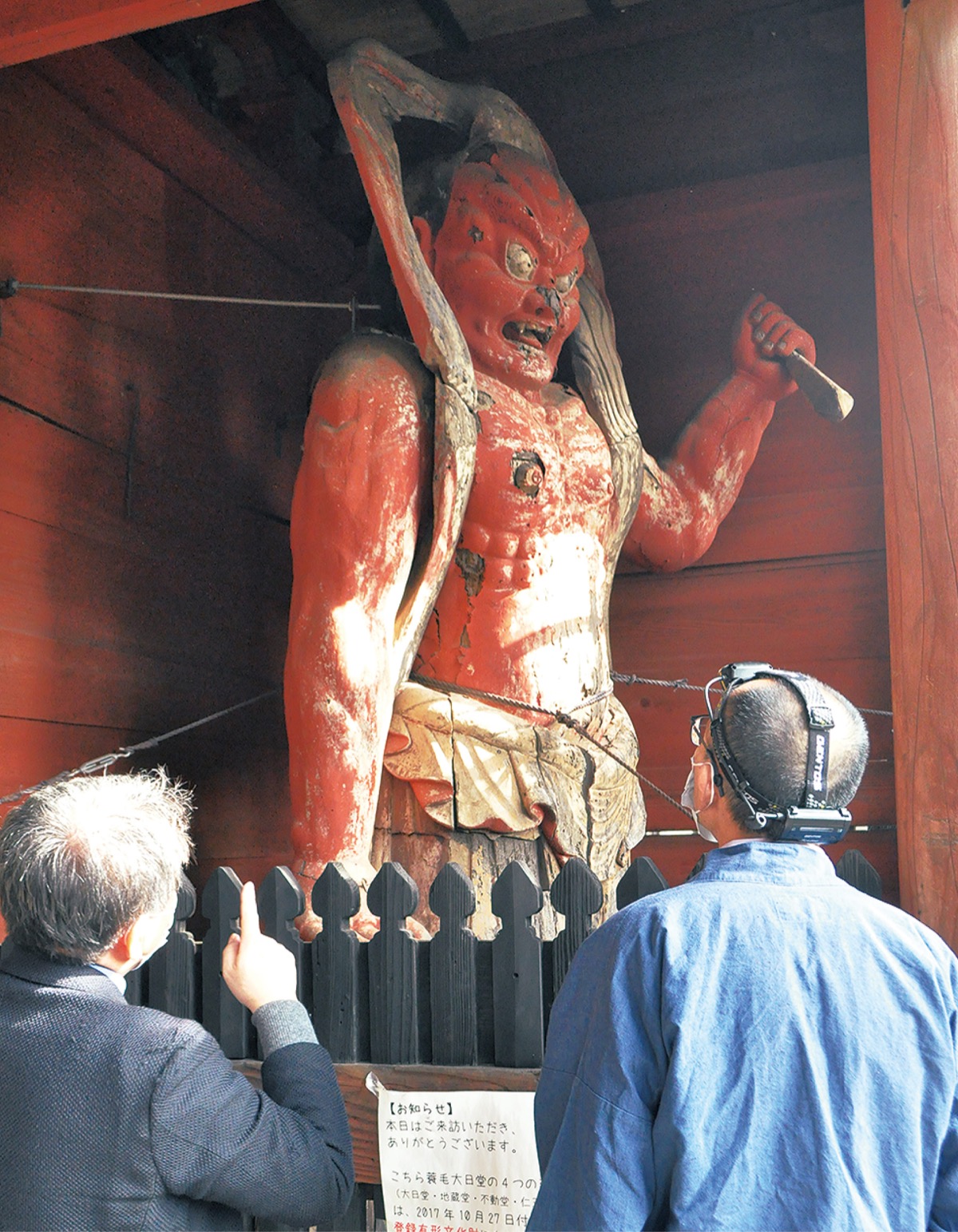 11月の調査には東京国立博物館学芸員の浅見龍介氏、株式会社明古堂の仏像修復士・明珍素也氏、日本通運株式会社美術梱包担当が現地に。浅見氏の鑑定で「二王像は平安末期、不動堂の不動明王像も平安時代のもので非常に素晴らしい」という評価を得た。