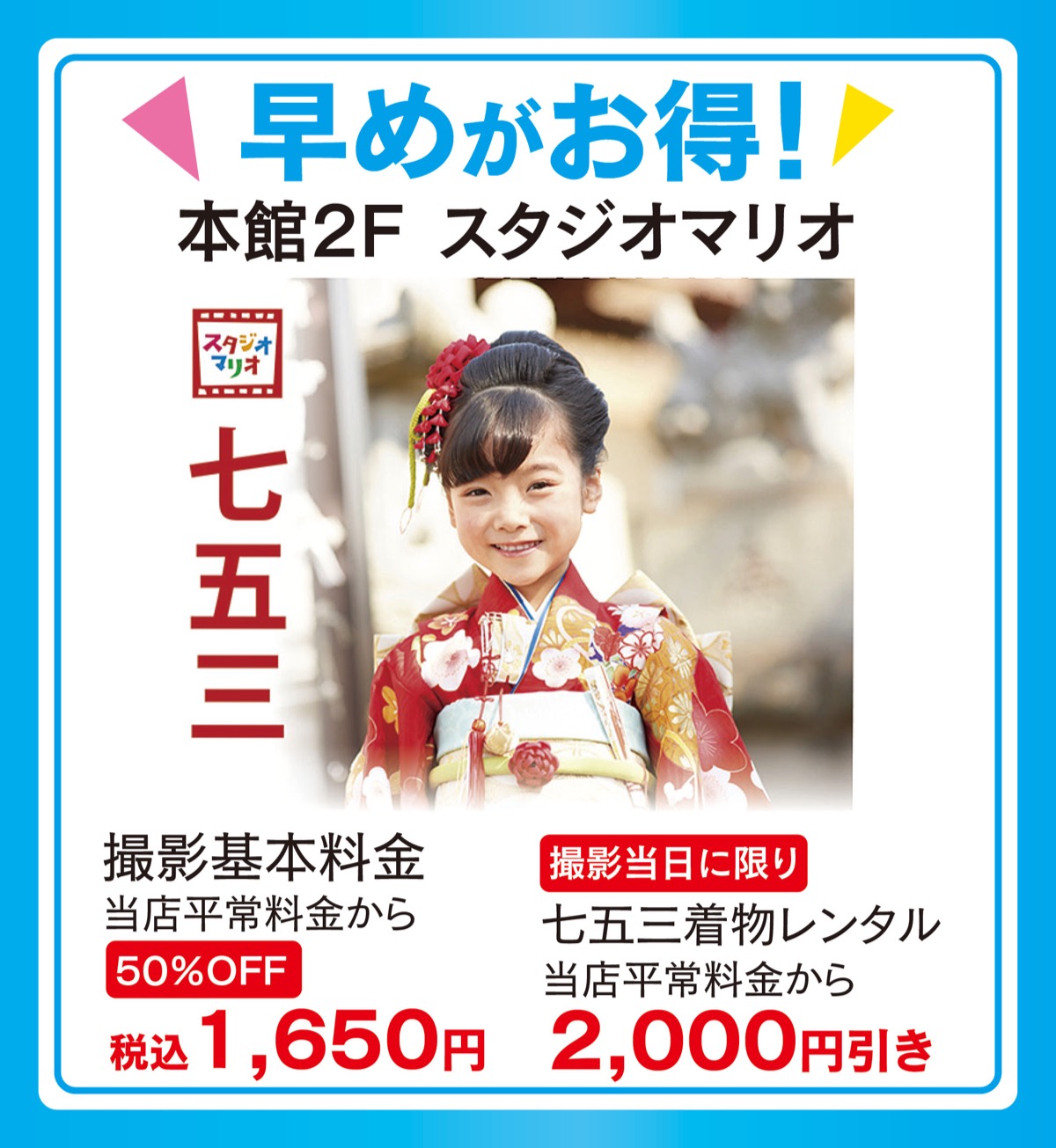 そのほか各店でお得なセールや割引も開催中。本館2階スタジオマリオでは、七五三の撮影基本料金が半額になるほか、着物レンタルも2千円引きに。早めの撮影がお得です。