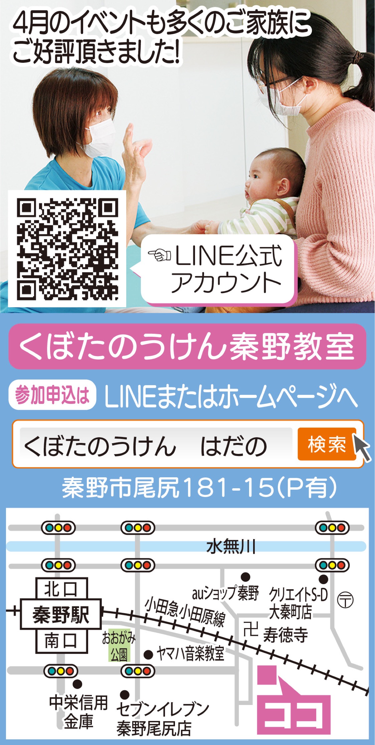 脳科学研究と昔ながらの子育ての知恵を融合した育児法で、賢い脳を育てる『くぼたのうけん秦野教室』。9月の開校に向けて0〜2歳児対象のイベントを開催中!5月の開催は▽12日(水)・26日(水)「色を感じて手先を動かそう〜育脳あそび編」/19日(水)「カスタネットを手作りしよう〜リズムあそび編」/10時〜11時・13時〜14時▼8日(土)プレママ・プレパパ講座/妊娠7ヶ月頃から対象、10時〜11時(各回参加費300円、定員3組)。