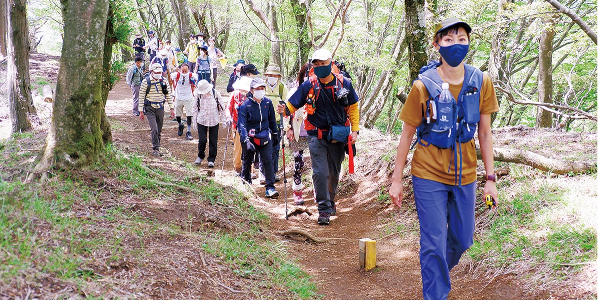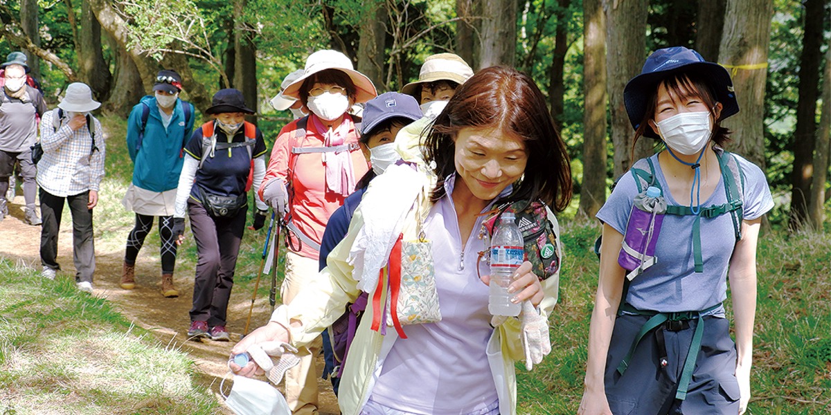福島さんと立石さんの掛け声によって10時30分に登山スタート。この日は晴天に恵まれ、時折涼しい風が吹く山歩きには絶好のコンディション。参加者は起伏に富んだ登山道を適度な距離を保ちつつ、進んでいった。