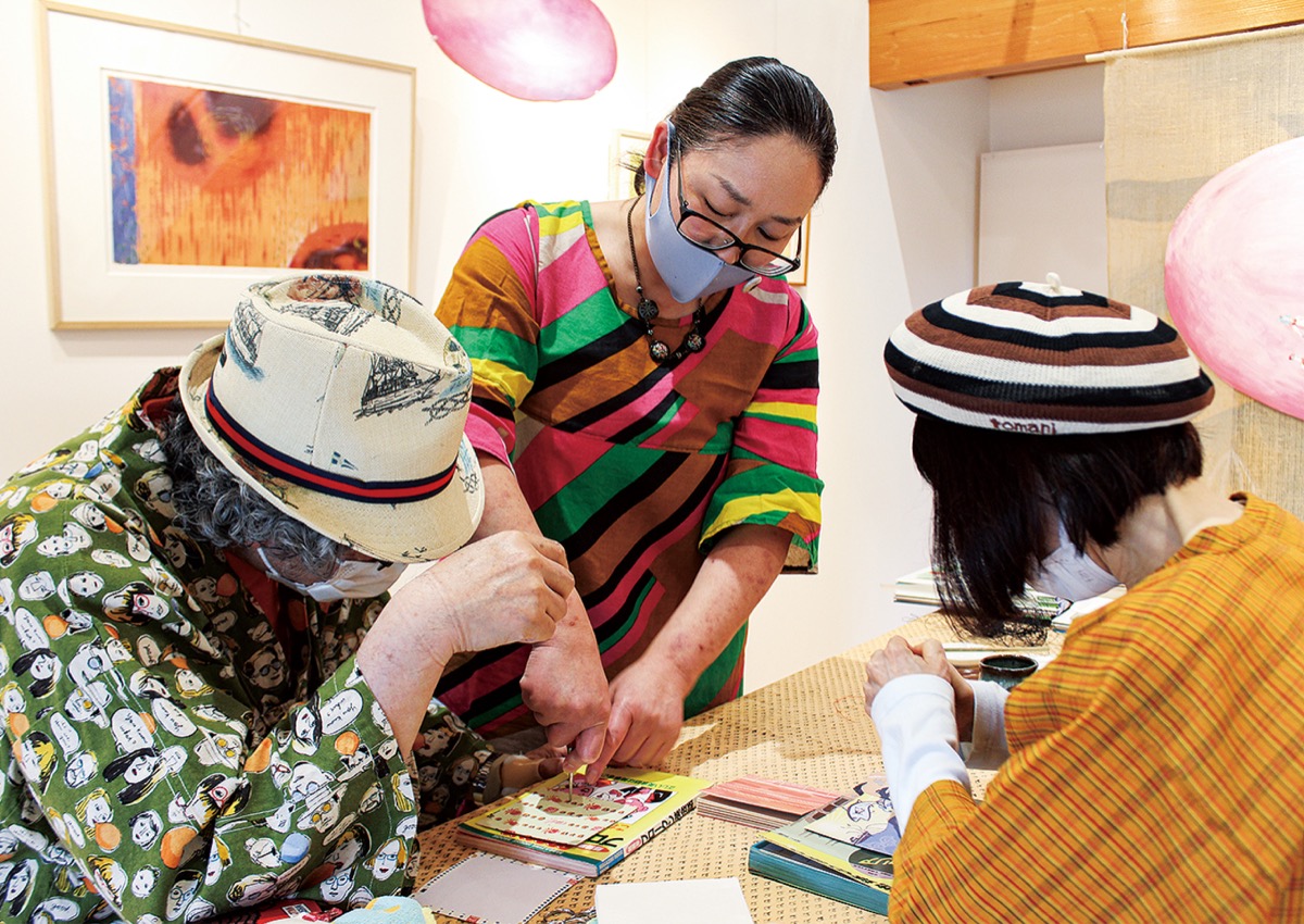 また期間中は新型コロナ感染症拡大防止のため、予約制で糸綴じ製本のワークショップも行われた。参加者はご当地千代紙から好きなものを選んで表紙にして、制作を楽しんでいた。