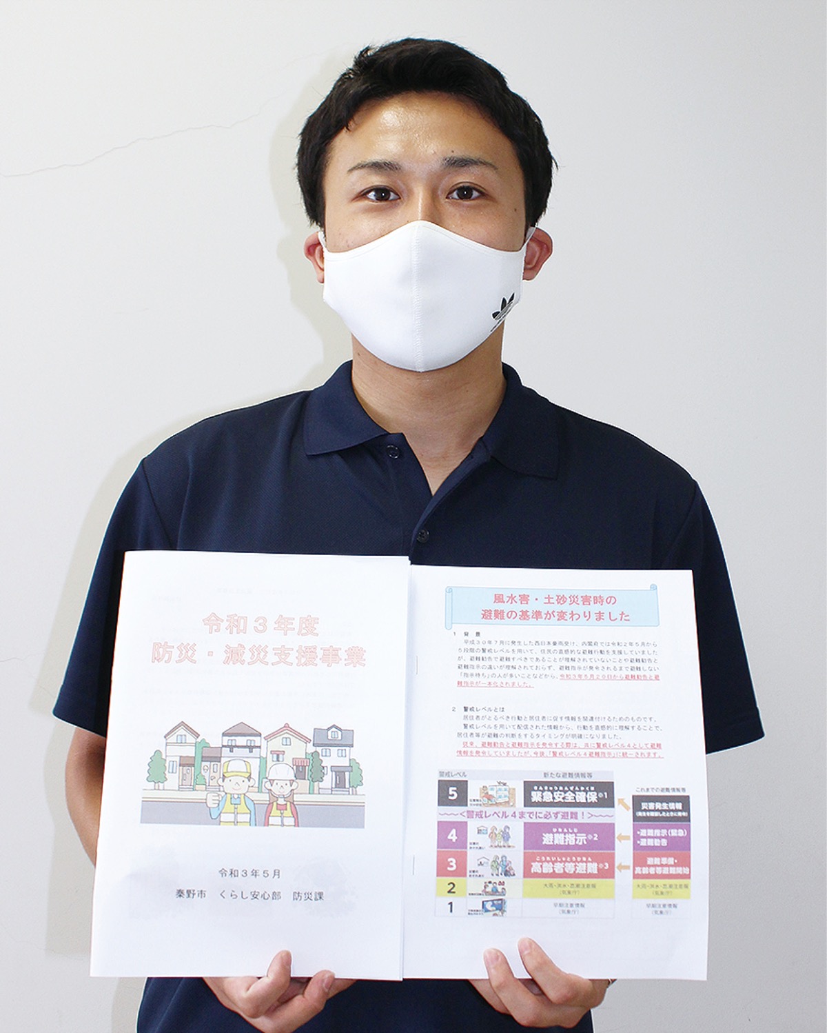 秦野市は変更点を市民に伝えるだけでなく、コロナ禍で災害時に備える訓練などを実施しにくいことから、風水害や土砂災害時の行動や情報の入手方法などと合わせてまとめた資料を製作し、5月末から自治会の回覧で周知した。ほかにも自治会内にある自主防災会240カ所に防災や減災支援をする行政サービスなどをまとめた冊子「令和3年度防災・減災支援事業」を配布した。防災課窓口でも配布している。