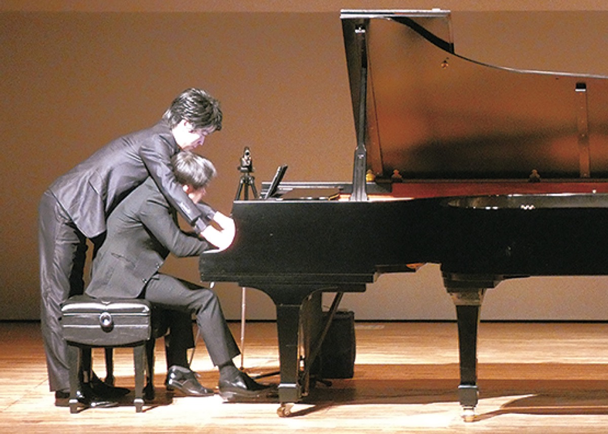 また第一部の最後に演奏した連弾『2つのロシアの主題によるコンチェルティーノ』(ローゼンブラット)では、この曲ならではの一風変わった奏法を披露。椅子に座っている米津さんの後ろに、小瀧さんが立って覆いかぶさる「二人羽織」のような体制で演奏した。