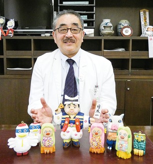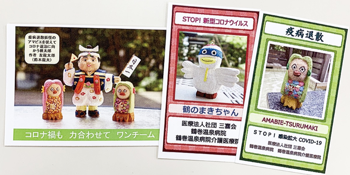 鶴巻温泉病院(秦野市鶴巻北1の16の1)の正面玄関受付で、疫病退散祈願の妖怪「アマビエ」と同院公認のゆるキャラ「鶴のまきちゃん」の木彫り人形が来院客をお出迎えしている。一見、木彫りには見えないカラフルな着色とユーモラスで可愛らしい表情。作者は左(ひだり)龍太郎氏。何を隠そう医療法人社団三喜会理事長、日本介護医療院協会会長など様々な肩書を持つ同院院長・鈴木龍太先生(68)の作品なのだ。