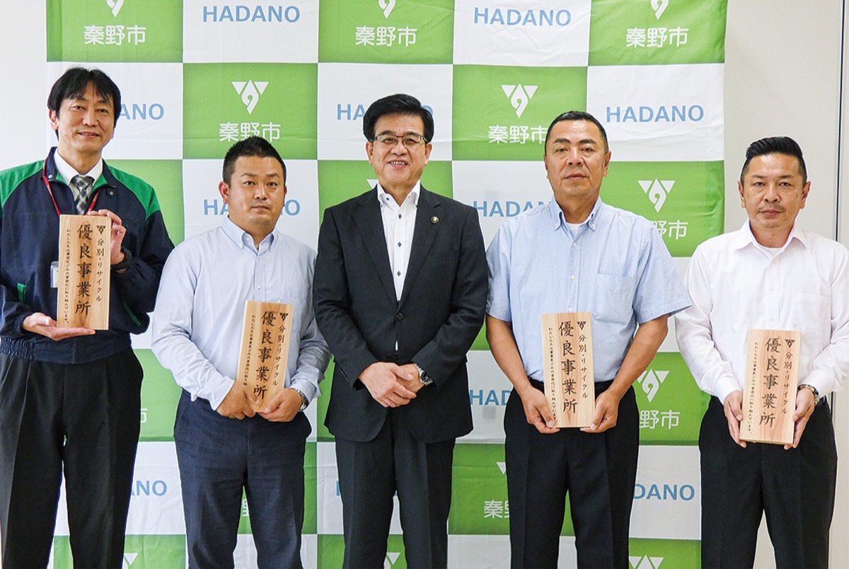 今年3月に創設以来、初の認定を受けた「分別・リサイクル優良事業者」は、セブンイレブン秦野尾尻店・同秦野駅北口店・同秦野幸町店・同秦野西大竹店(高橋大助オーナー)、ミアクチーナ鶴巻店(阿部毅店長)、ミアクチーナ秦野曽屋店(水安真一店長)の2社6事業所。セブンイレブン4店舗では、分別の徹底や店頭における呼びかけ、地域清掃の実施などの取り組みが認められた。また、ミアクチーナ2店舗では、分別の徹底や従業員への環境教育、フードドライブの実施、資源物等の店頭回収などが評価された。