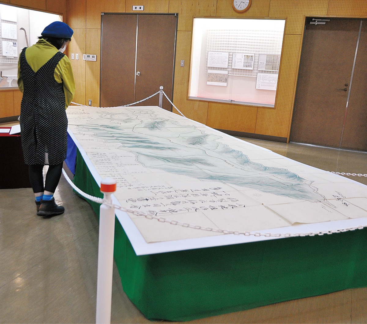 展示室中央には、五カ村(堀四カ村・渋沢)の大絵図を設置。これは1874年(明治7年)に設置された内務省が各府県に指令した地籍編さん事業によって全国で作成された「地租改正地引絵図」で、田畑の面積や位置、土地利用の様子や区画・所有者等が記載されている。
