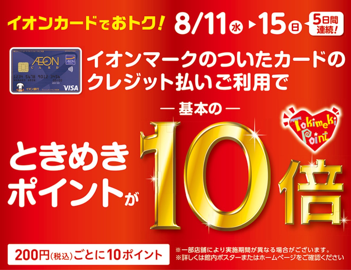 8月11日(水)から15日(日)までの5日間はイオンマークのついたカードでクレジット払いをすると、ときめきポイントが10倍に。とってもお得なこの機会に、今欲しいあのアイテム、素敵なファッション、食べたいグルメを買っちゃおう。