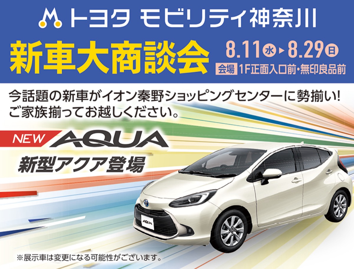 本館1階正面入口前と無印良品前では、同じく11日からトヨタモビリティ神奈川が「新車大商談会」を開催。今話題の新車が勢揃いするので、乗り心地など、ぜひご体感を。