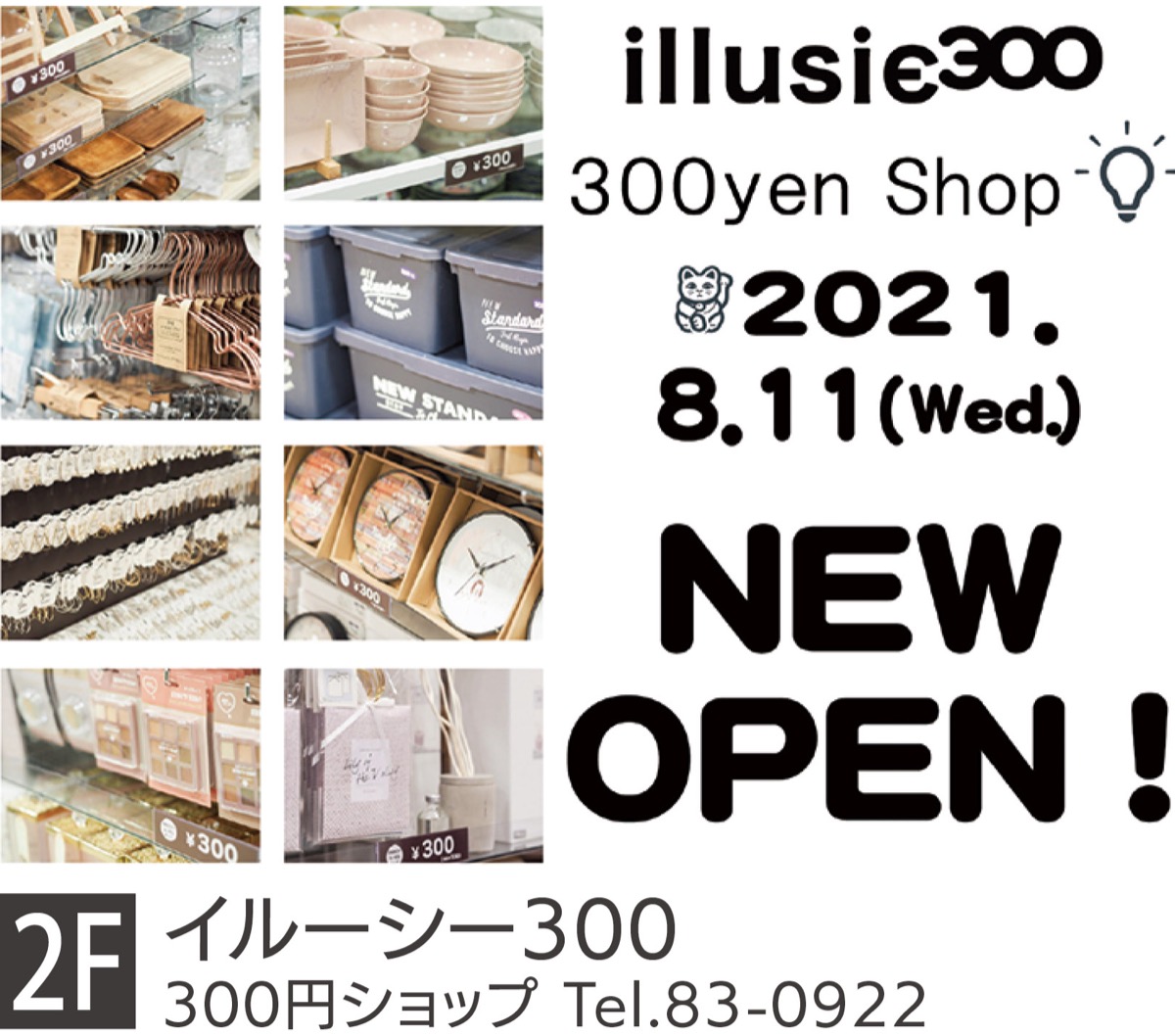 本館2階に11日、300円ショップ「イルーシー300」がオープン!かわいくておしゃれな生活雑貨がお手頃価格で手に入れられるので、ぜひチェックしてみて。