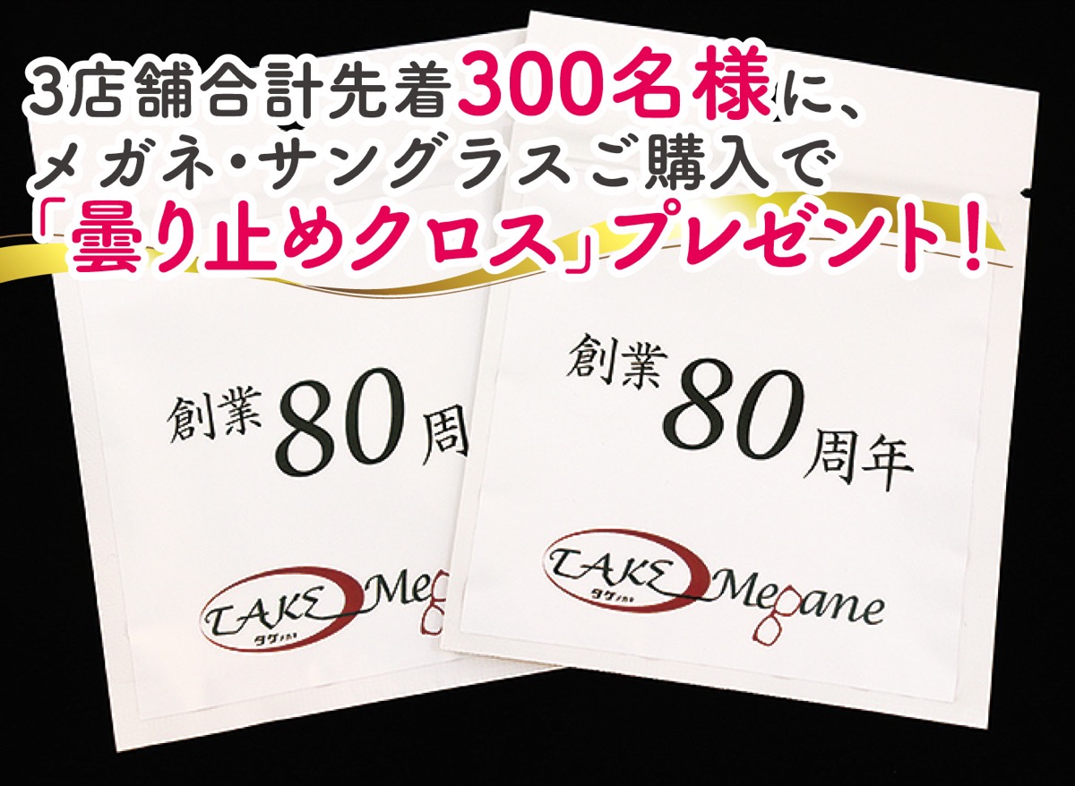 さらに、メガネまたはサングラス購入で、先着300名に「曇り止めクロス」のプレゼントもあるのでこの機会にぜひ。