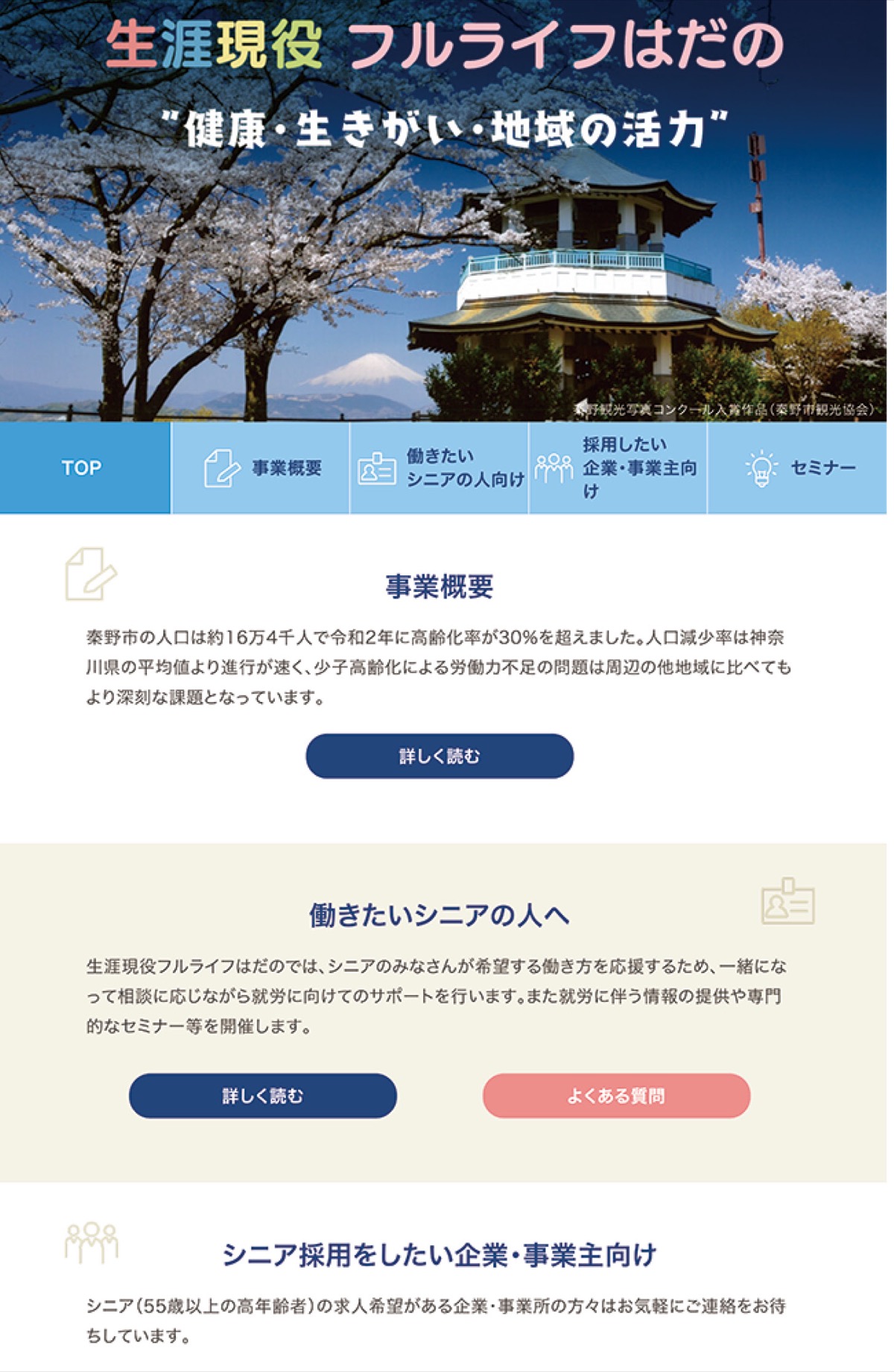 一方、求人を検討している企業・事業主についても随時募集中。「生涯現役フルライフはだの」の相談員が事業説明などのため企業訪問を行っているほか、窓口での相談、ホームページからダウンロードできる『求人情報提供届』での求人情報登録などを受け付けている。費用は全て無料。