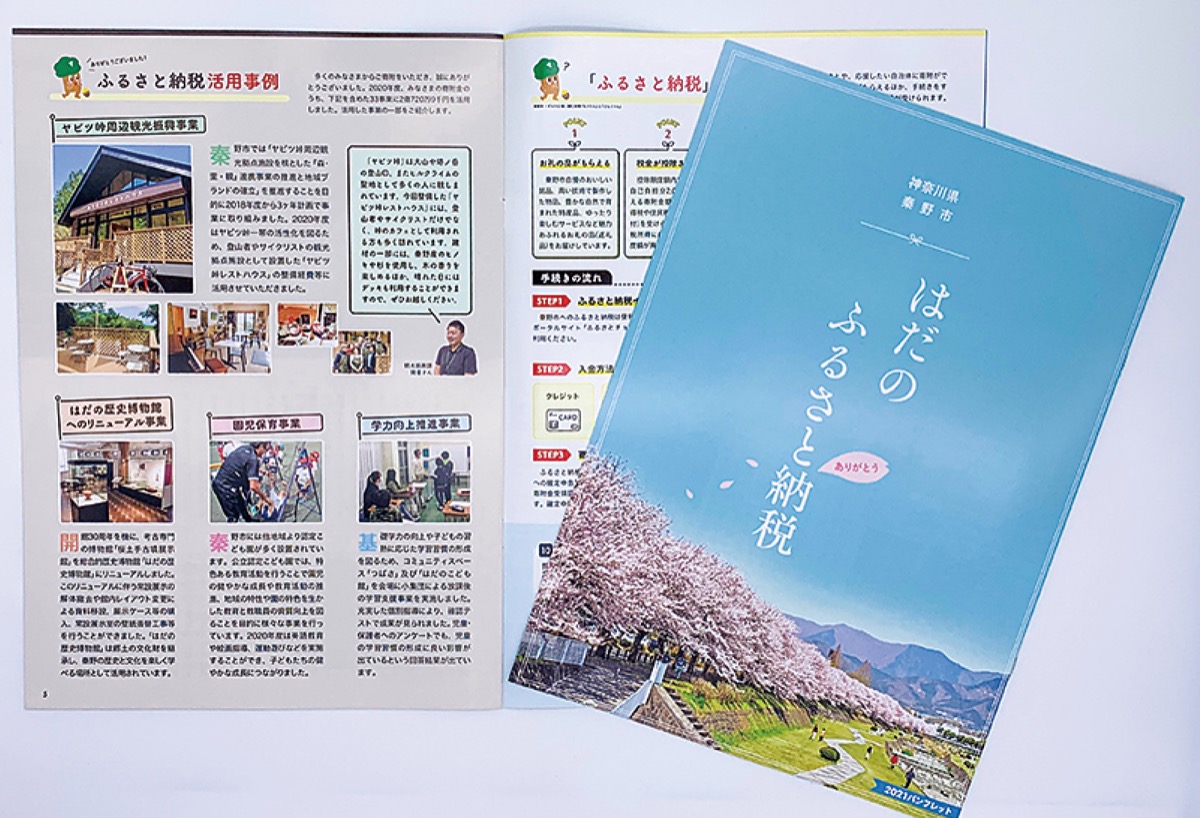 このパンフレットは、秦野市のふるさと納税寄附者に寄附金の活用事例を伝えるとともに、次回への納税の参考にしてもらおうというもの。A4判、16ページ仕立てとなっており、観光スポットが秦野市の春夏秋冬と共に紹介されている「はだの歳時記」やふるさと納税の仕組み、2020年度の寄附金活用事例などが掲載されている。また、ふるさと納税の返礼品を提供している事業者も紹介。今回は9事業者が掲載され、それぞれが行っている企業努力や返礼品の製作秘話など、秦野市内の事業所の魅力を伝える内容となっている。