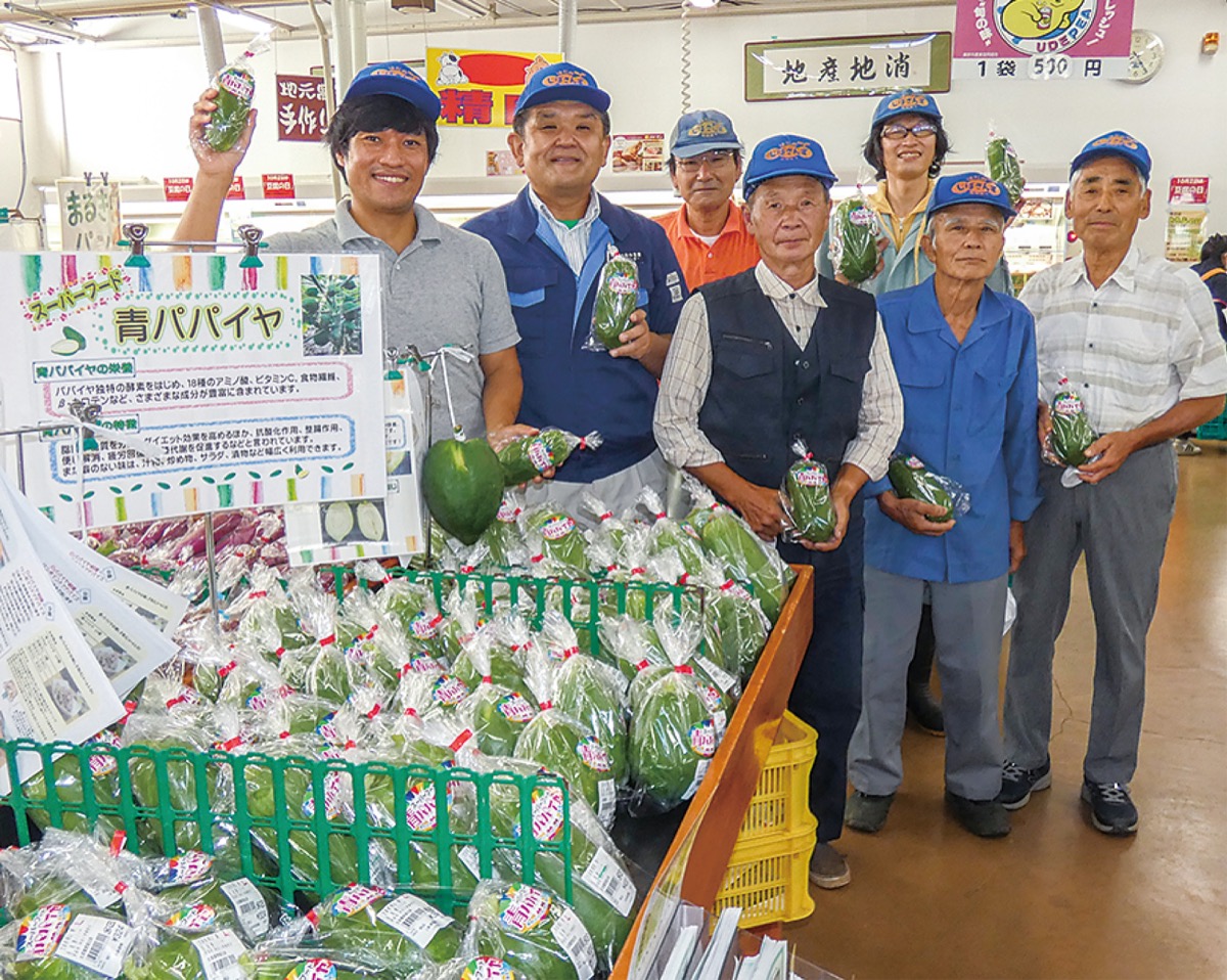初売りとなった10月2日、じばさんずに納品したのは5人。売り場には『スーパーフード青パパイヤ 秦野名水の里で育んだ農産物』というラベルが貼られた青パパイヤが、約80個並んだ。