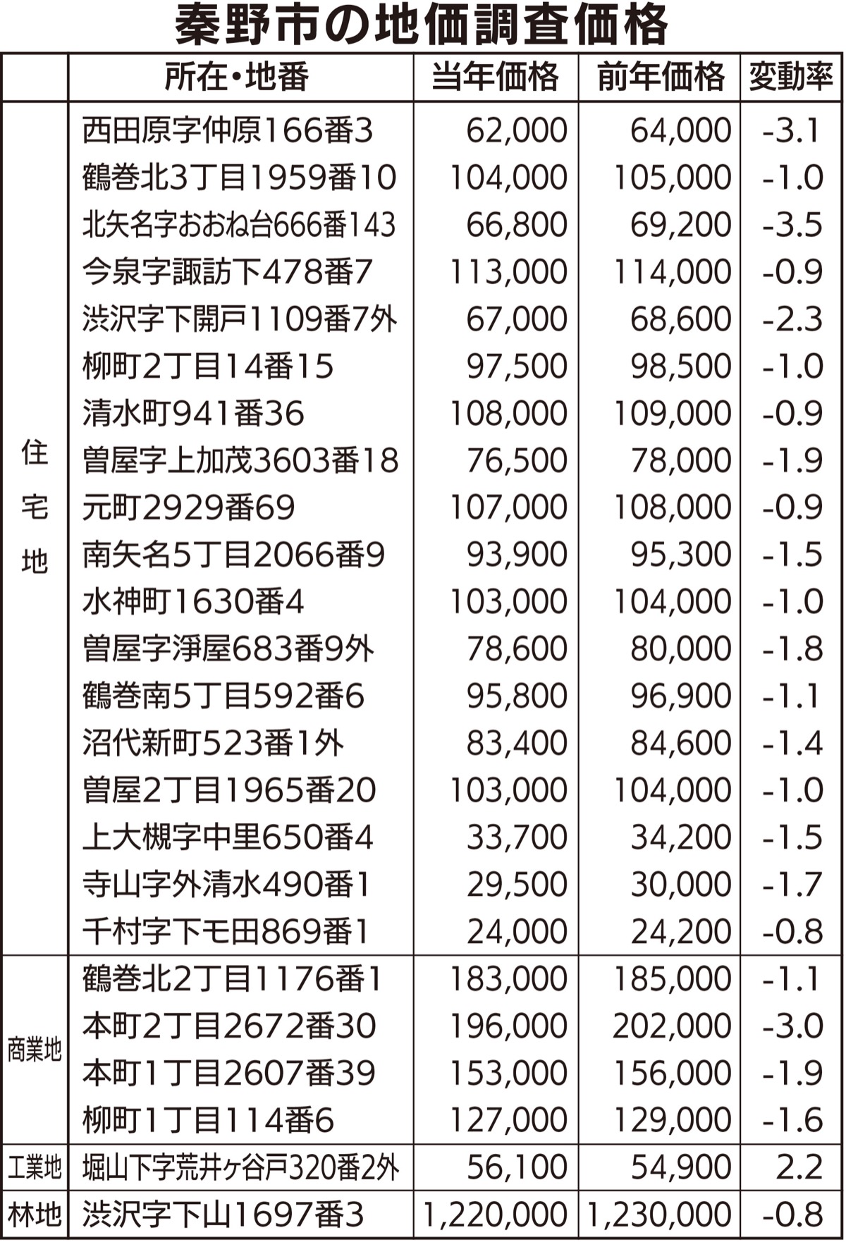 県内の商業地では、コロナ禍の影響で昨年は地価上昇率が大幅に鈍化し変動率0・2%となったが、今年は0・8%と0・6ポイント拡大している。しかし秦野市では下げ幅は昨年に比べ0・3ポイント縮小しているものの、平均価格は16万4800円(前年16万8000円)で、平均変動率マイナス1・9%。最も変動率が低かったのは「鶴巻北2丁目1176番1」でマイナス1・1%、最も大きいのは市内最高額である19万6000円(前年20万2000円)の「本町2丁目2672番30」で、変動率はマイナス3・0%と大幅の下落となっている。