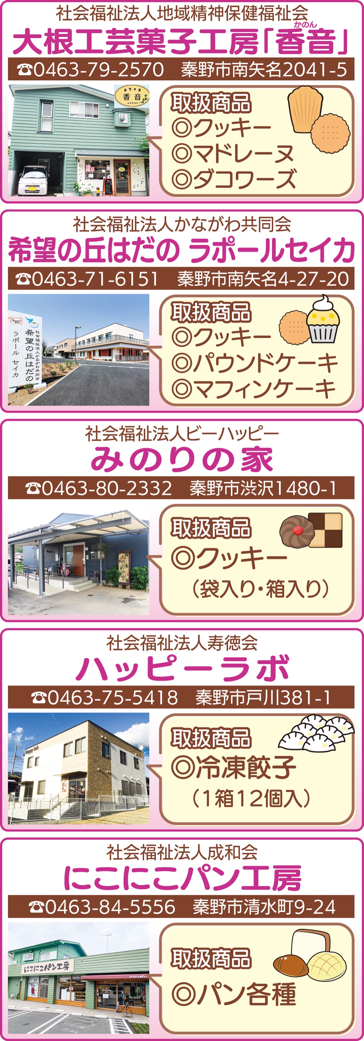カタログで紹介されているのは大根工芸菓子工房「香音」、希望の丘はだのラポールセイカ、みのりの家、ハッピーラボ、にこにこパン工房の5施設。それぞれの施設の紹介のほか、どんな商品を取り扱っているか、金額や注文可能数、注文期限、配達の有無、問い合わせ先などが写真入りで掲載されている。