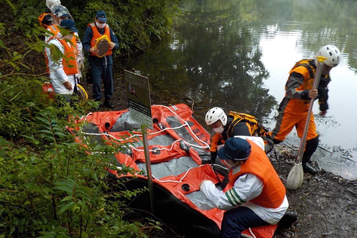 訓練は、震生湖付近を散策していたハイカーが誤って湖に転落したと想定。救命ボートの組み立て方や操縦、水中にいる要救助者をボートで救助する訓練などを行った。これまで震生湖で救命ボートを使っての救助経験がなく、現場で組み立てを行ったのも初めてのこと。署員らは指導を受けながら、対応方法や連携などを一つひとつ確認していた。