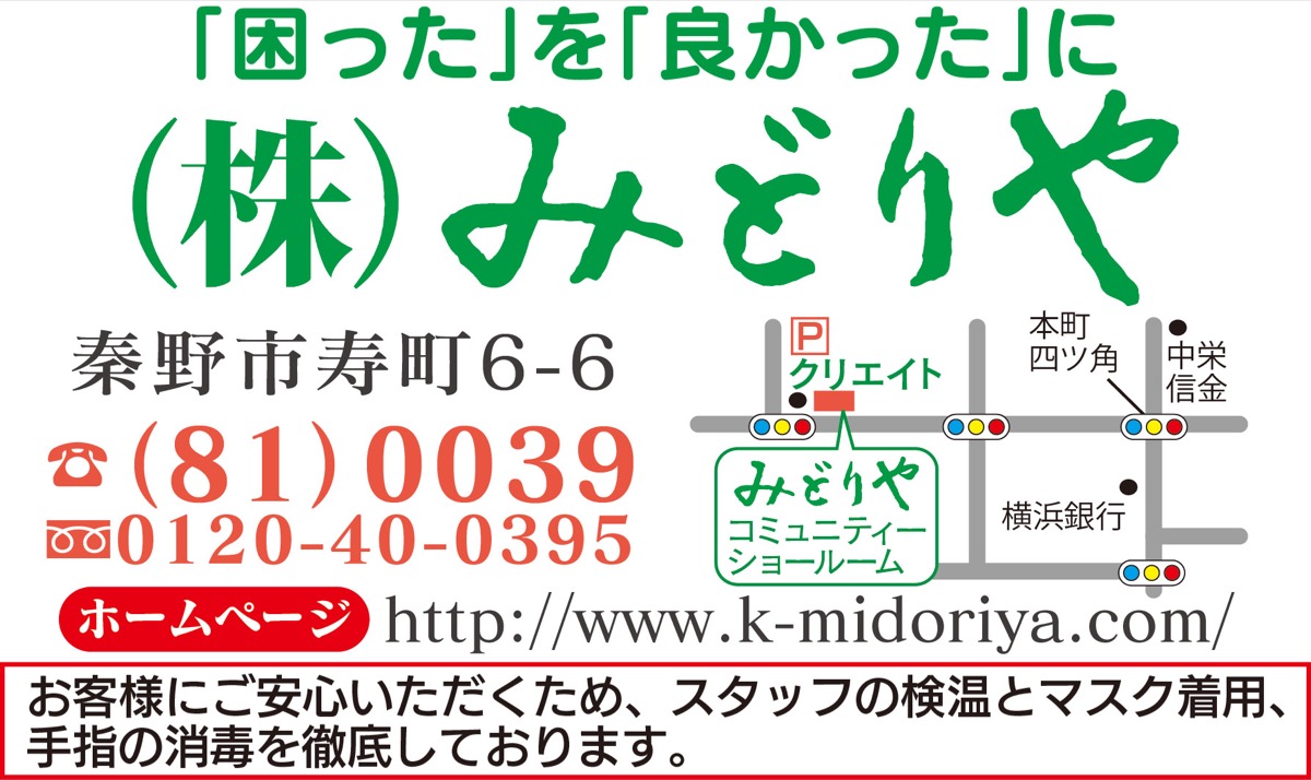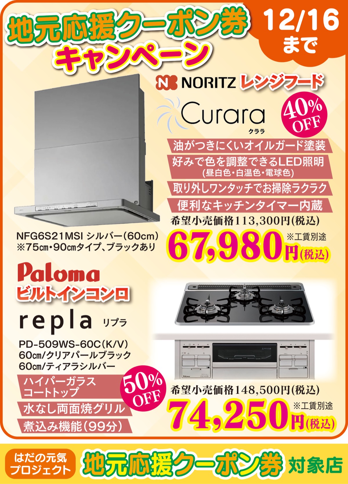 市民の暮らしを支える(株)みどりや(露木徳英社長)では秦野市の地元応援クーポン券第2弾に合わせ、ノーリツのレンジフード「クララ」と、パロマのビルトインコンロ「リプラ」を特別価格で提供。購入時の領収書を使い12月19日までに応募すると、2千円分のクーポン券が送付される。