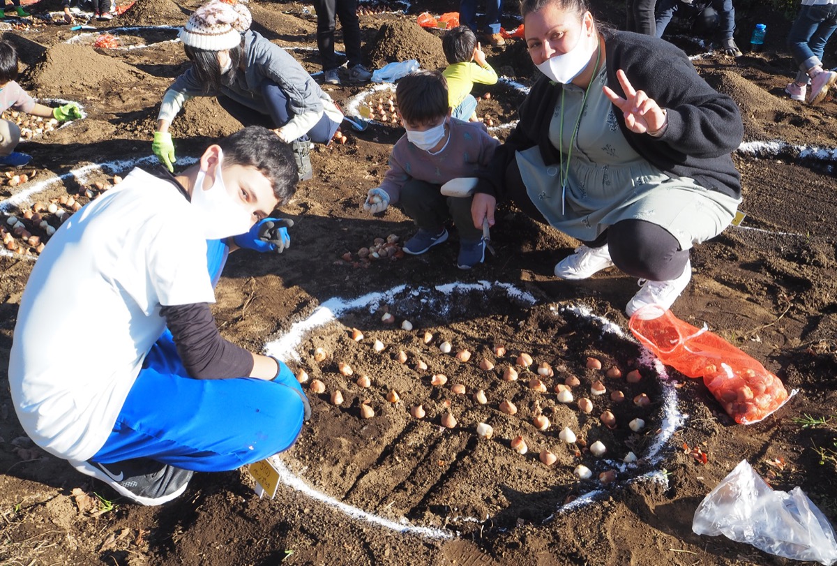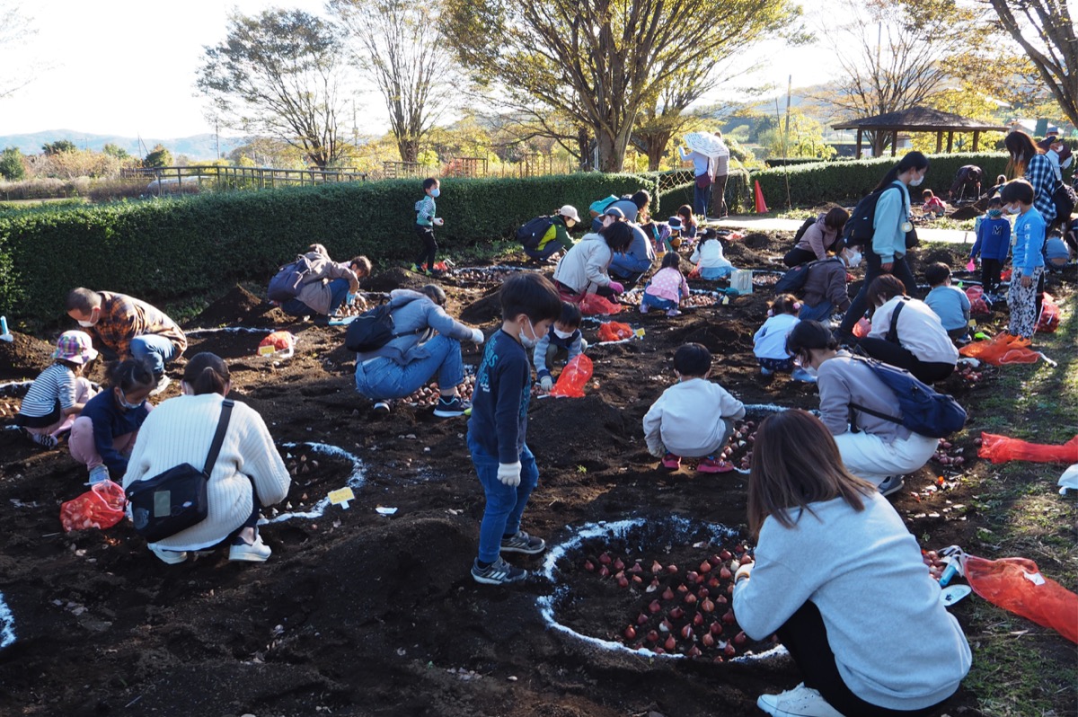 11日に参加した北幼稚園の親子らは、公園職員から球根の植え方や土のかけ方などの説明を受け、さっそく挑戦。わいわいとはしゃぎながら、手作業での植え付けを楽しんでいた。