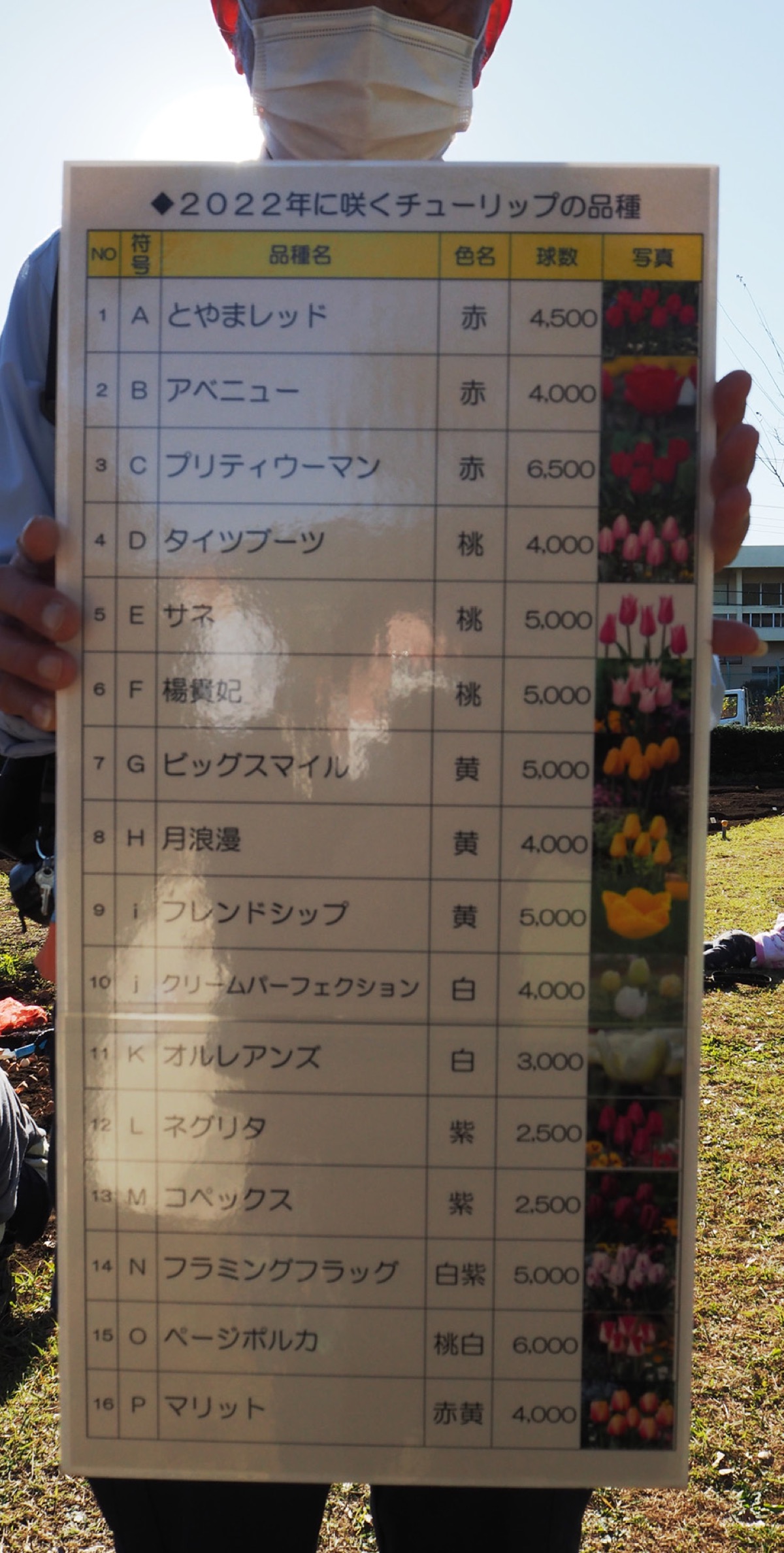 来春開花予定のチューリップは公園全体で16種7万球。品種名は、とやまレッド、アベニュー、プリティウーマン、タイツブーツ、サネ、楊貴妃、ビッグスマイル、月浪漫、フレンドシップ、クリームパーフェクション、オルレアンズ、ネグリタ、コベックス、フラミングフラッグ、ページポルカ、マリット。公園職員によると3月下旬から咲き始めるという。
