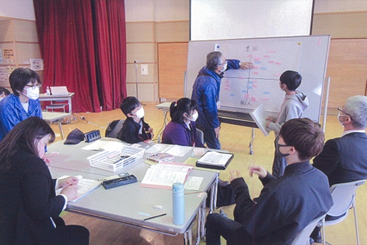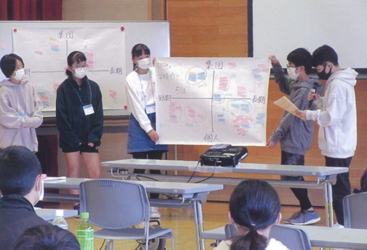話し合いは自分の意見を付箋に書き出し、グループ内で発表しながら同じような意見をグループ化させて整理する『KJ法』で行われた。参加者らは模造紙に短期・長期、集団・個人の座標軸を記入。それぞれが出した意見を適当な場所に貼り付けて、グループの意見をまとめていった。