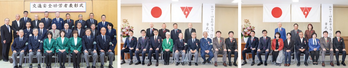 【交通栄誉章緑十字金章】▽古谷光一(秦野市交通安全協会)【交通栄誉章緑十字銀章】▽高橋貞二(秦野市交通安全協会)【関東管区警察局長・関東交通安全協会連合会会長連名表彰】▽小泉勉(交通指導員)【県知事表彰】▽北村敏明(秦野市交通安全協会)、志村ハル子(秦野市交通安全協会母の会)【県警察本部長協力者表彰】▽小林佳子(秦野市交通安全協会母の会)【県警察本部長・地域交通安全活動推進委員連名表彰】▽諸星義晴(秦野市交通安全協会)、石原隆男(指導員)【県警察本部長・県交通安全協会会長連名表彰(緑十字銅賞)】▽関野功(秦野市交通安全協会)、池田武夫(同)、古宮伸次(同)、久保寺賢一(同)、山口昭一(同)、田山満男(指導員)、芦川伸一(同)、稲毛久夫(同)【県交通安全協会会長表彰】▽高橋文雄(秦野市交通安全協会)、安部俊行(同)、宇佐美一生(同)、佐倉守(同)、桐ケ谷保(指導員)、阿部保夫(秦野市交通安全協会)【関東管区警察局長・関東安全運転管理者協議会連合会会長連名表彰】▽優良事業所/府川電機工業(株)【県知事表彰】▽交通安全功労団体/日産車体(株)秦野事業所【県警察本部長・県安全運転管理者会連合会会長連名表彰】▽交通安全功労者/山口伸一((株)YDKテクノロジーズ秦野事業所)▽優良安全運転管理者/小関幸夫((株)魚作)▽優良運転者/宮川昭(日産車体(株)秦野事業所)▽優良事業所/スタンレー電気(株)秦野製作所、(株)島半【県警察本部長表彰】▽優良運転者(自家用)/武克之(市消防署)、青木寛雄(日産車体(株)秦野事業所)【県安全運転管理者会連合会会長表彰】▽交通安全功労者/清水朋文(秦野自動車教習所)▽優良安全運転管理者/三浦義政((有)北京館)▽優良事業所/(株)新和防災、医療法人財団青山会みくるべ病院、レモンガス(株)秦野店▽優良運転者/関口哲(秦野自動車教習所)、武藤幸雄(同)、滝本篤志(市消防本部)、小野寺隆二(日産車体(株)秦野事業所)