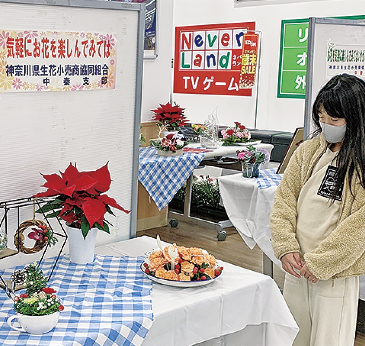 神奈川県生花小売商協同組合中秦支部(加藤昇支部長)が12月3日から5日まで、イオン秦野ショッピングセンター別館2階で展示を行った=写真上。同組合は今年度異業種とのコラボレーションをテーマにしており、中秦支部では「花を気軽に楽しむ」と題して12人のメンバーが身近にある皿やカップ、お菓子の缶などに神奈川県産を中心とした花を飾り付けた。フォトスポットコーナー=写真下=も登場し、加藤支部長は「イオン秦野店の渡邉浩昌店長のご協力で展示できた。花を身近に感じてもらい、気軽に楽しんでもらえたら」と話した。