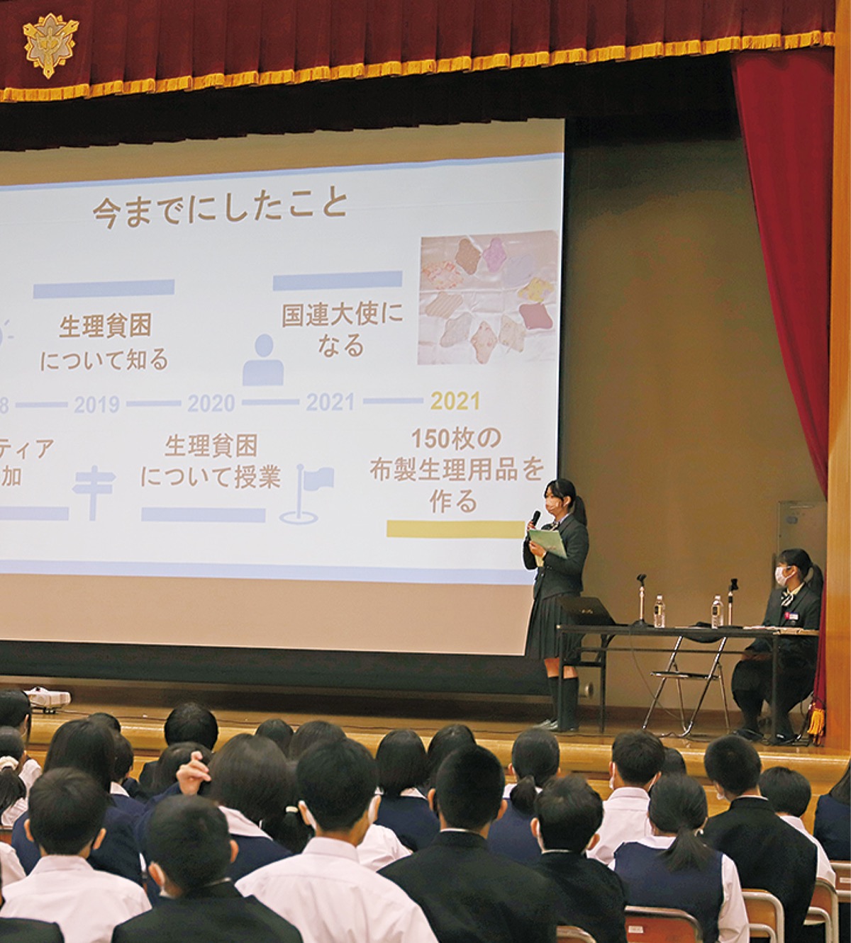 グローバルユース国連大使を務める自修館中等教育学校(伊勢原市)4年生の入野真緒さんと稲垣綾香さんの2人は12月10日、本町中学校を訪れ、同中学1年生を対象に行われたSDGs学習会で講師を務めた。