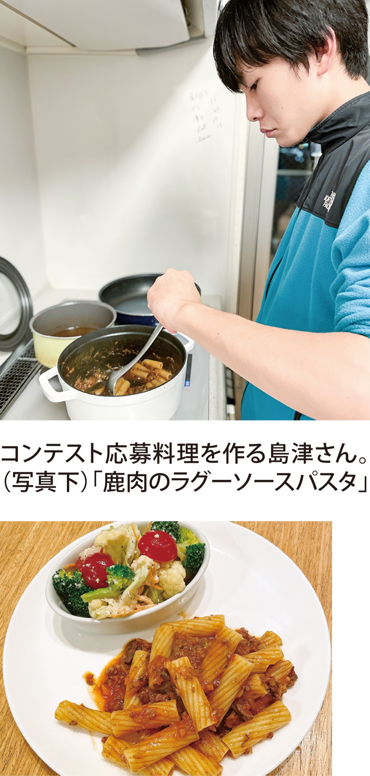 今年の応募総数は、488点。11月10日に最終審査が行われた。最優秀賞に決まったのは「鹿肉のラグーソースパスタ」を作った島津義央(よしなか)さん(南中・2年)。「害獣被害のニュースを見て思いついた。食べ慣れない鹿肉を豚肉と合わせて食べやすくした」という。その他、入賞した料理名と入賞者は以下のとおり(敬称略)。