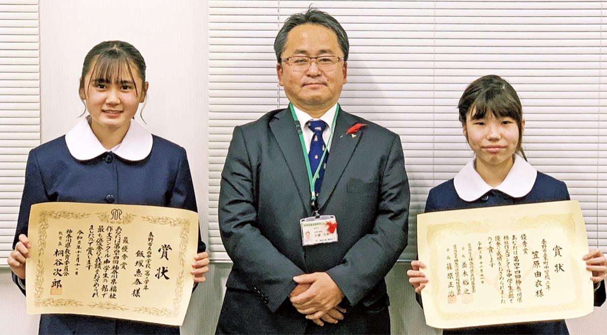 第44回神奈川県福祉作文コンクールの入賞者が決まり、秦野市から飯塚恵奈さん(西中1年)が中学生の部最優秀賞(県教育長賞)を、笠原由衣さん(本町中2年)が優秀賞を獲得した。小中学生を対象に、県内185校から5666編の応募があった中からの受賞。2人は12月11日に横浜で行われた表彰式に出席。その後21日に秦野市役所を訪れ、佐藤直樹教育長に受賞を報告した。