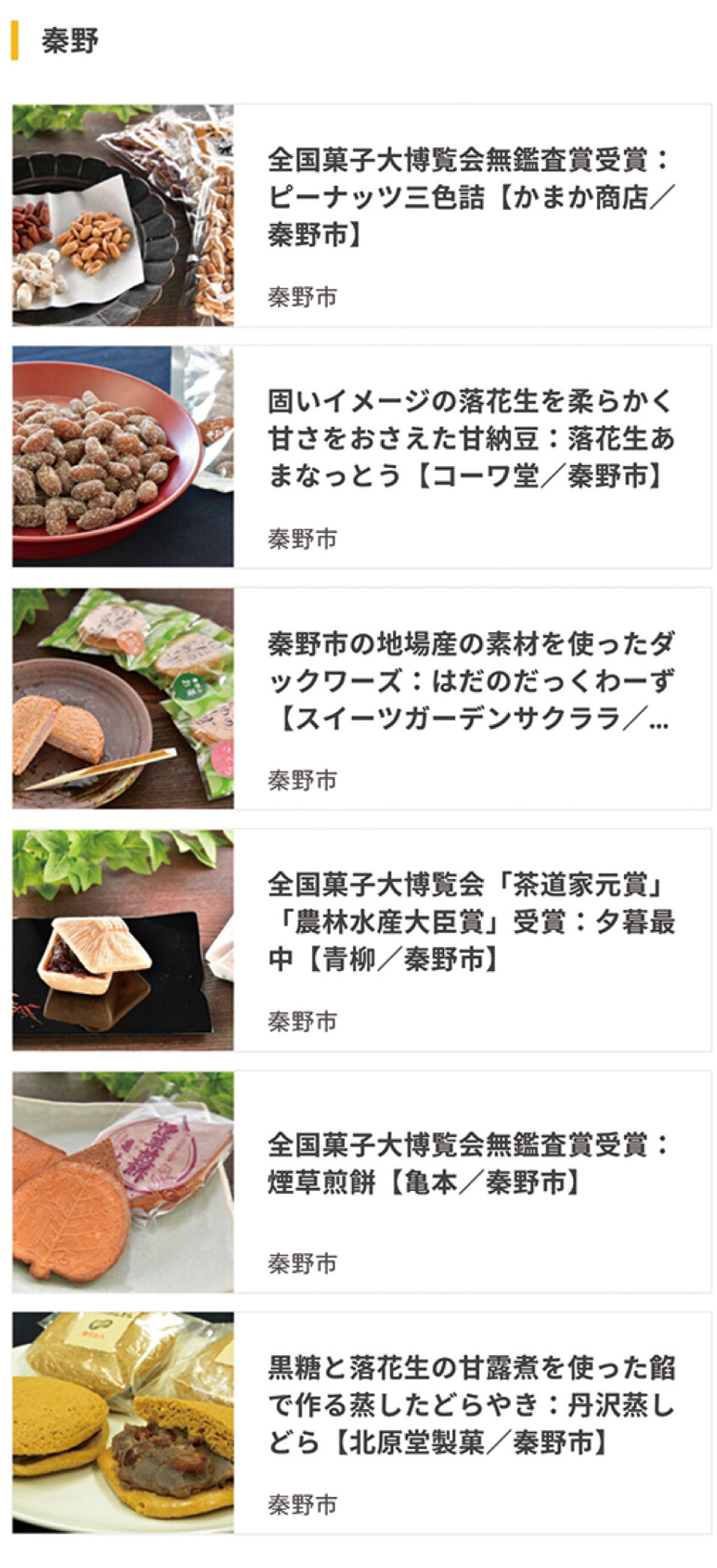 秦野市からは6店舗が掲載されている。秦野・伊勢原エリアでまとめられており、それぞれ個店のページでは、銘菓のほか店舗の紹介やその他の売れ筋商品、オンライン販売へのリンクなどが紹介されている。