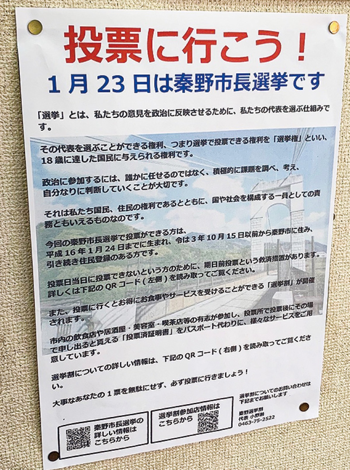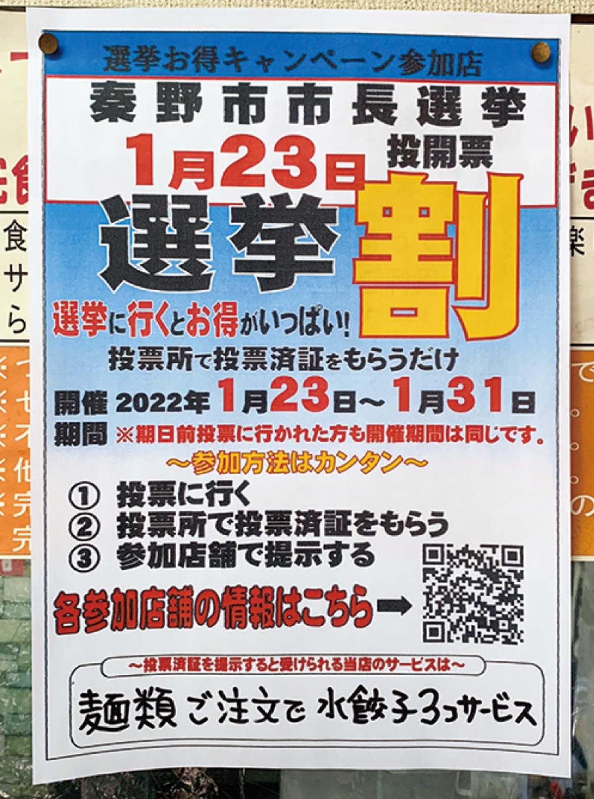 1月23日(日)に投開票される秦野市長選挙に合わせ、秦野市内有志の店舗が投票率向上のための取り組みを行っている。投票済証明書を提示すると会計の割引などのサービスが受けられるというもので、1月17日時点で27店舗が参加している。