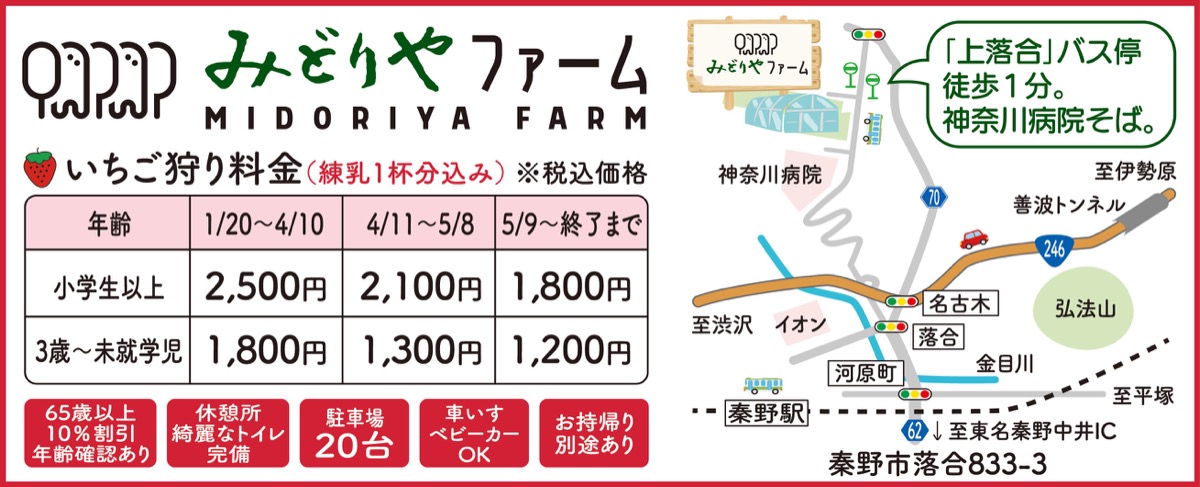 施設は高設栽培でバリアフリー、駐車場や休憩所、綺麗なトイレ完備で老若男女問わず安心して楽しむことができる。
