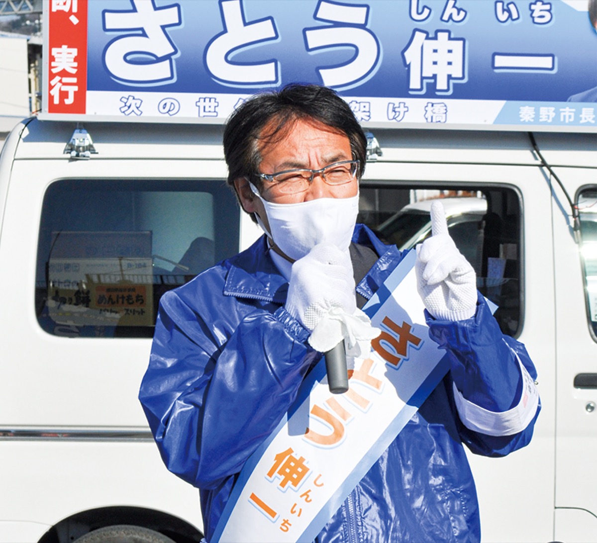 「市政一新」「決断、実行。」を合言葉に選挙戦を繰り広げた新人の佐藤伸一氏。「自分が一番人脈や情報ネットワークを持っている現役の今が、秦野のために恩返しができるタイミング」と32年間勤めた秦野市役所を退職し、政治家として選挙戦に臨んだ。
