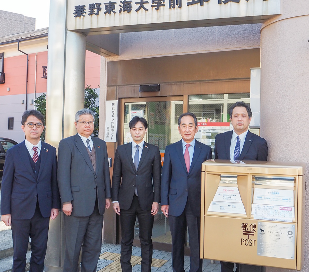 お披露目当日は秦野郵便局の川崎利克局長、小田原浜町郵便局の高梨哲也局長、東秦野郵便局の関野宏一局長、秦野駅前郵便局の川上貴仁局長、設置局の小松局長ら関係者が参加し、ゴールドポストの設置を祝った。