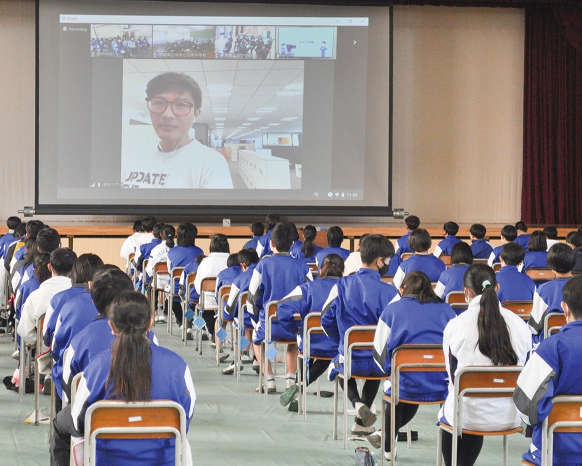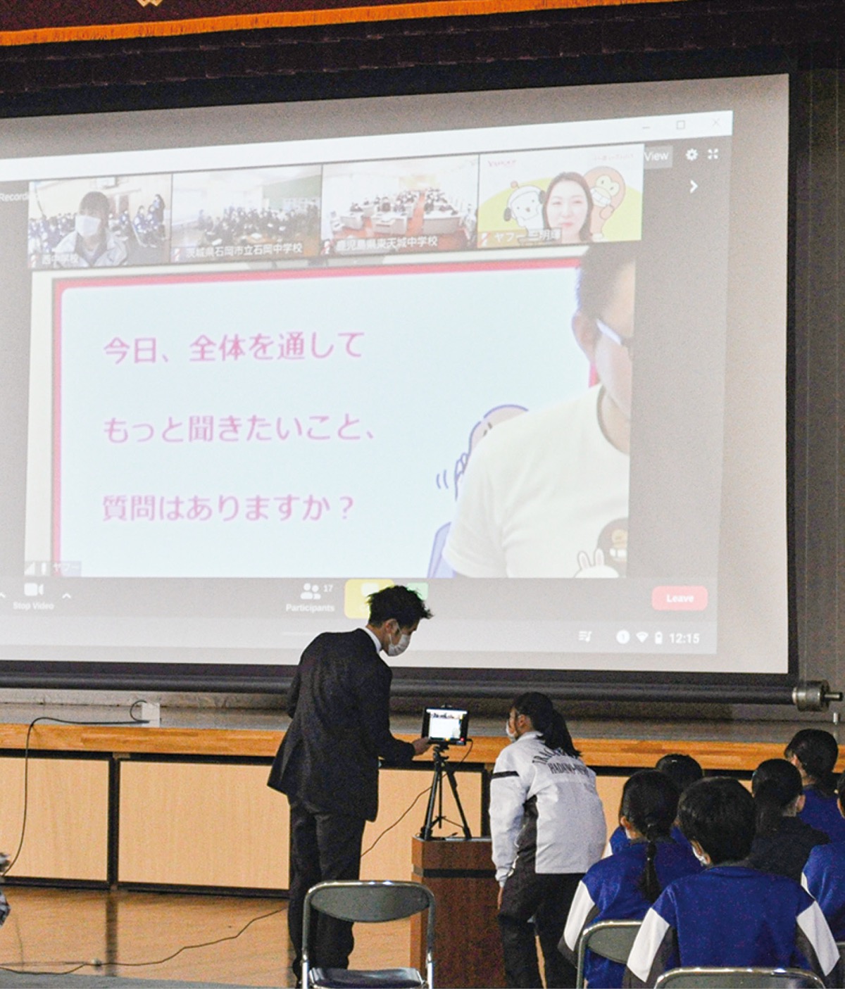 当日は西中学校の他に鹿児島県徳之島町の東天城中学校、鳥取県江府町の江府中学校、茨城県石岡市の石岡中学校の生徒も参加。学年主任の谷津裕教諭によると西中ではコロナ禍で中止になった職場体験の代わりも兼ねており、生徒たちは総合的な学習のキャリア教育の中で事前に働くことの意味や職種などについて学び臨んだという。
