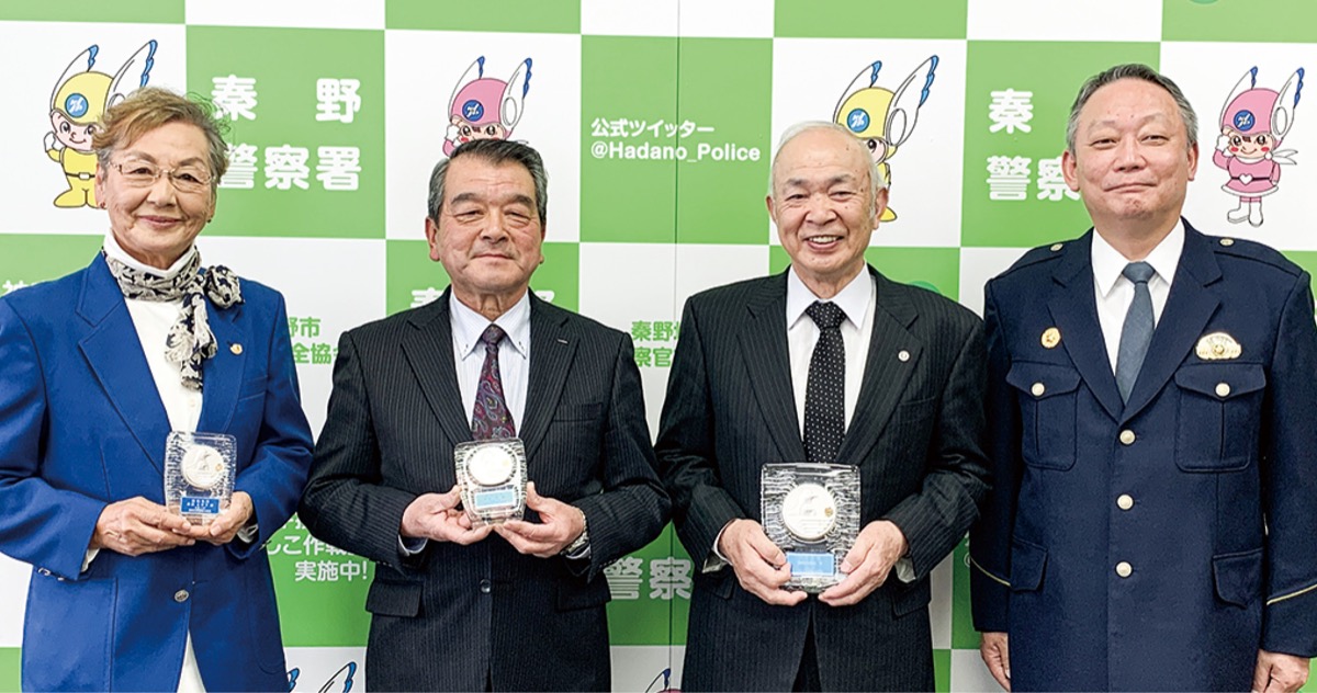 地域の防犯活動に尽力する個人、団体に贈られる神奈川県警察本部長褒章の伝達式が3月4日、秦野警察署(竹田茂署長)で行われた。個人の部では原田五保子さん(南矢名)、和田稔さん(柳川)、団体では秦野飲食店組合(川口浩太組合長)が表彰され、竹田署長から記念の盾が贈られた。