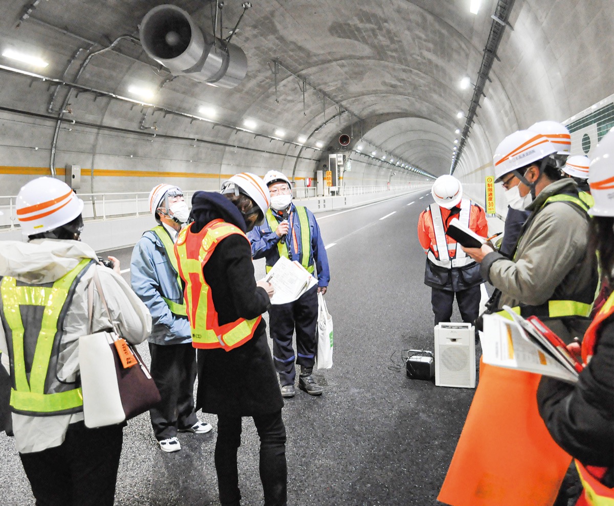 当日は多くの報道陣が集まり、秦野丹沢スマートICからマイクロバスで移動。最初の羽根トンネルではプロジェクションマッピングを使ったトンネル内投影技術や、新たな工夫を凝らした排煙装置(ジェットファン)など最新技術を説明。上下線を繋ぐ非常用通路も見学した。