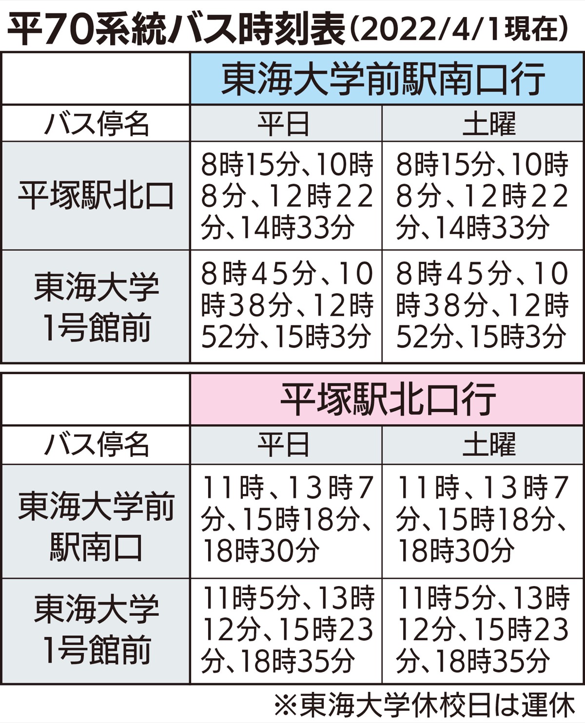 神奈川中央交通は4月1日から「平70 平塚駅北口〜東海大学1号館前〜東海大学前駅南口」系統の運行を開始した。