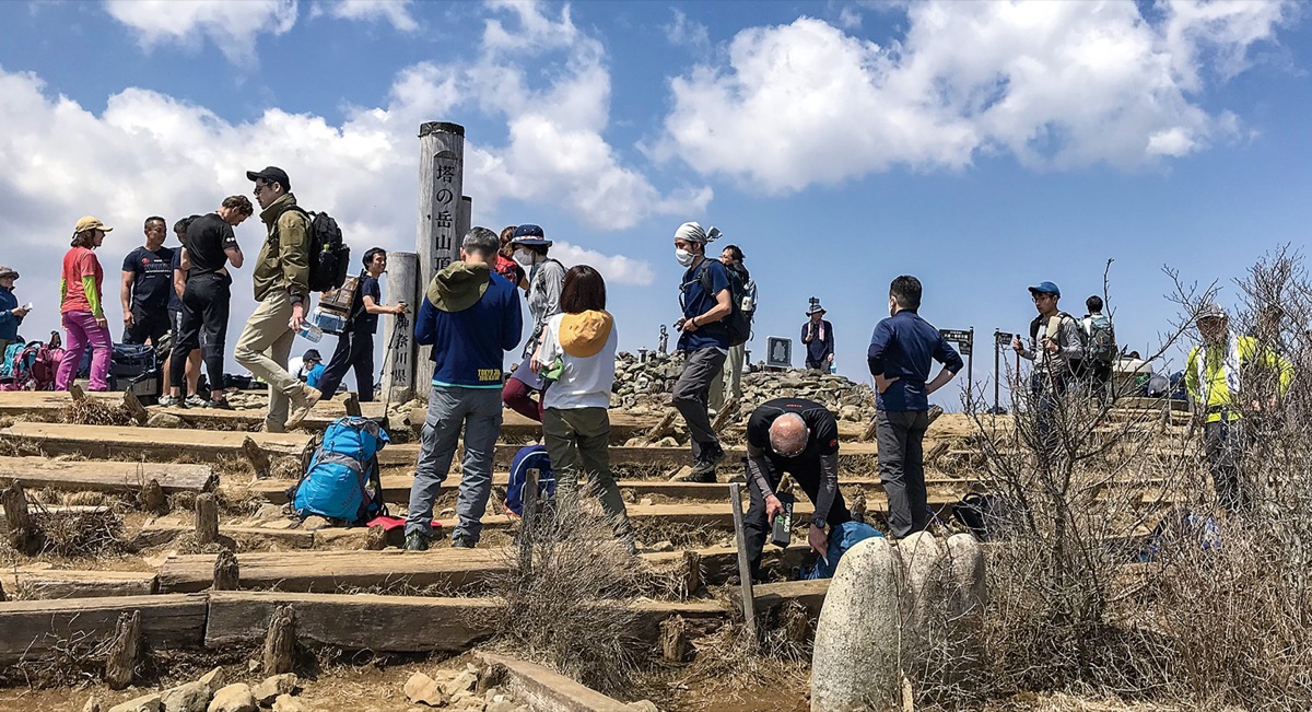 ヤビツ峠から表尾根を縦走してきた人、鍋割山から回ってきた登山者、丹沢山を経てきたハイカーなどが交錯する塔ノ岳は、昼前頃には大変なにぎわい。山頂では多くの人が食事を作ったり、持参したおにぎりを食べたり、コーヒーを沸かしたりして過ごしていた。楽しそうに景色を見渡すグループや仲良く写真を撮るカップルなど、登頂を果たした達成感のある笑顔をみせていた。