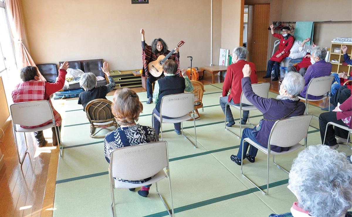 広畑ふれあいプラザのいきがい型デイサービス金曜班で4月8日、チャランゴ・ギター奏者の木下尊惇(たかあつ)さんが演奏を披露した。