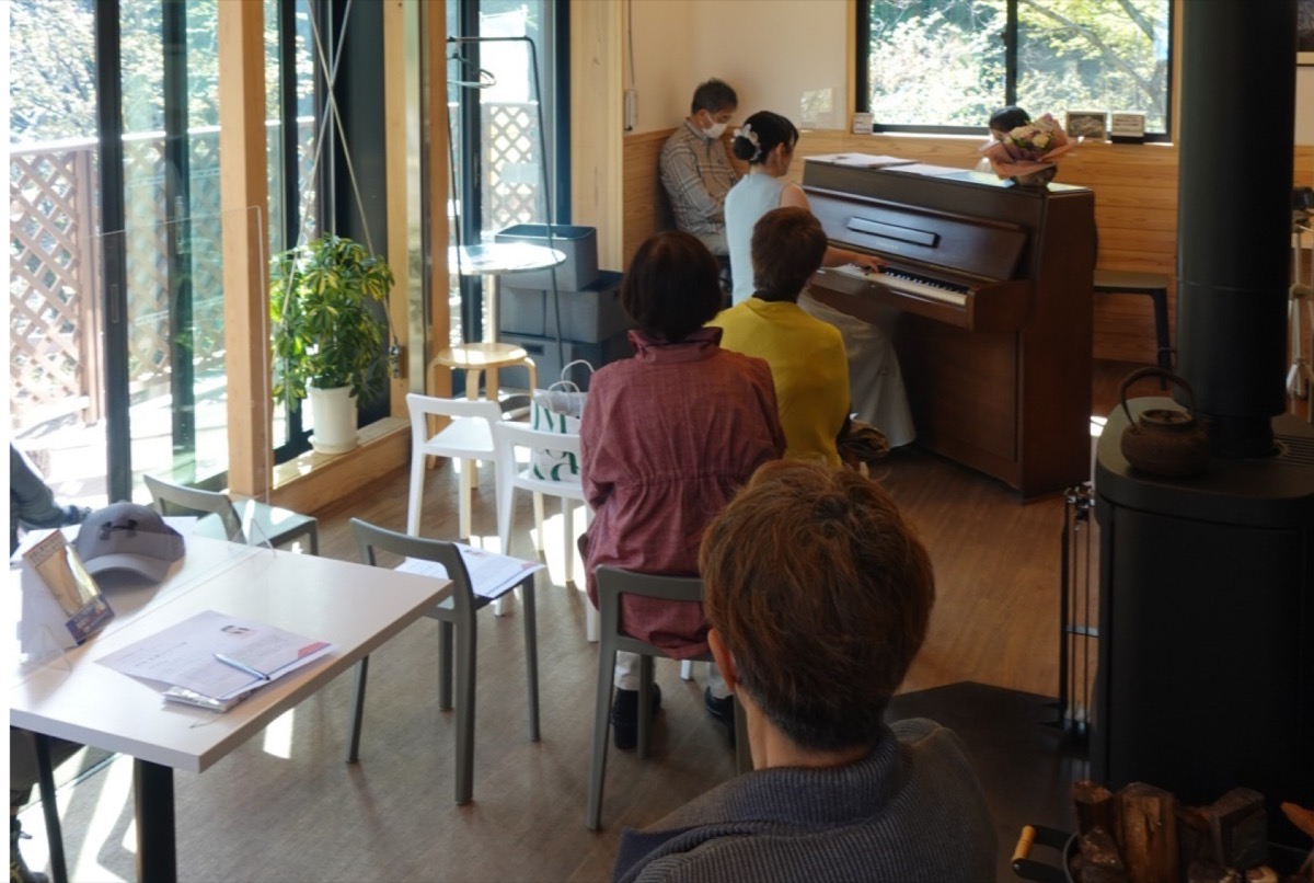 ヤビツ峠レストハウスで4月22日、ティータイム・コンサート「岩元志真ピアノと歌」が開催され、約20人が来場。丹沢の新緑の中での演奏を楽しんだ。