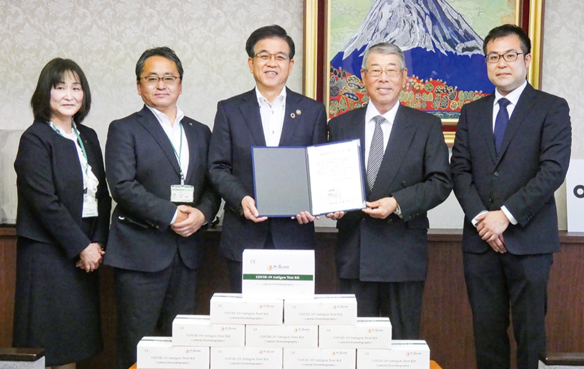 同社はギフト商品や販促用品の企画販売、感染症対策関連商品などを扱っており、20年10月にも市に非接触型体温計50台を寄付している。高橋市長は「教育環境を守ることに貢献いただき感謝」と述べた。小中学校には抗原検査キットが配布されているが、第6波の際に使用され残り少なくなっている学校もあるという。今回のキットは主に教職員用として各校に配布される。