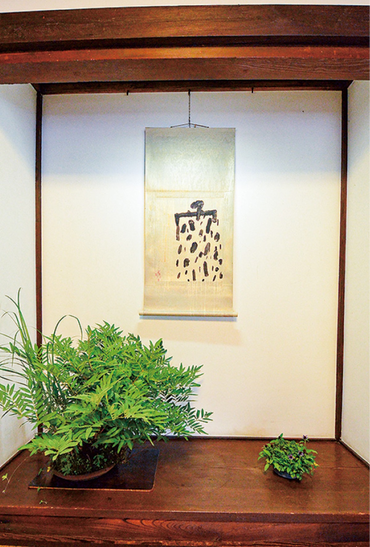これまでもギャラリーやカフェなどで個展を行ってきた村上さん。今回は江戸時代から残る旧家の「床の間」を使った席飾りに初挑戦する。村上さんは一級建築士の資格を持っており「お客様を迎え入れる床の間の良さ、しつらえを再認識してもらえれば」と話す。期間中は床の間5カ所に、自ら現代作家に依頼したという掛け軸と共に山野草が飾られる。「時代を超えてきた建物の中で、時間をかけて育ってきたこの季節ならではの野草の姿を見てほしい」と語った。陶芸家・山本安朗さんによる抹茶提供(有料)もあり。問い合わせは同施設【電話】0465・84・0050へ。