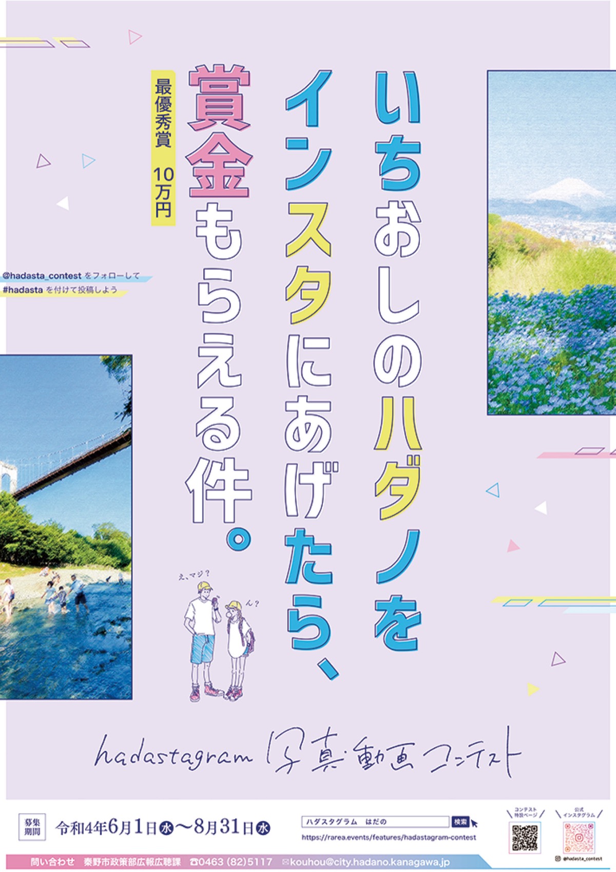 コンテストの詳細や応募方法などは市広報広聴課等で配布しているチラシなどから見ることができる。また、チラシはコンテスト特設ページ(https://rarea.events/features/hadastagram-contest)からもダウンロード可。問い合わせは同課【電話】0463・82・5117へ。
