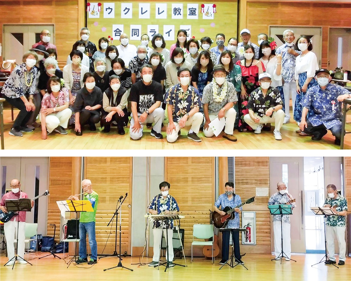 鶴巻南在住の小野田哲之さん(76)主宰のウクレレ教室合同ライブが5月29日、本町公民館多目的ホールで初めて行われ、約20曲を演奏した。