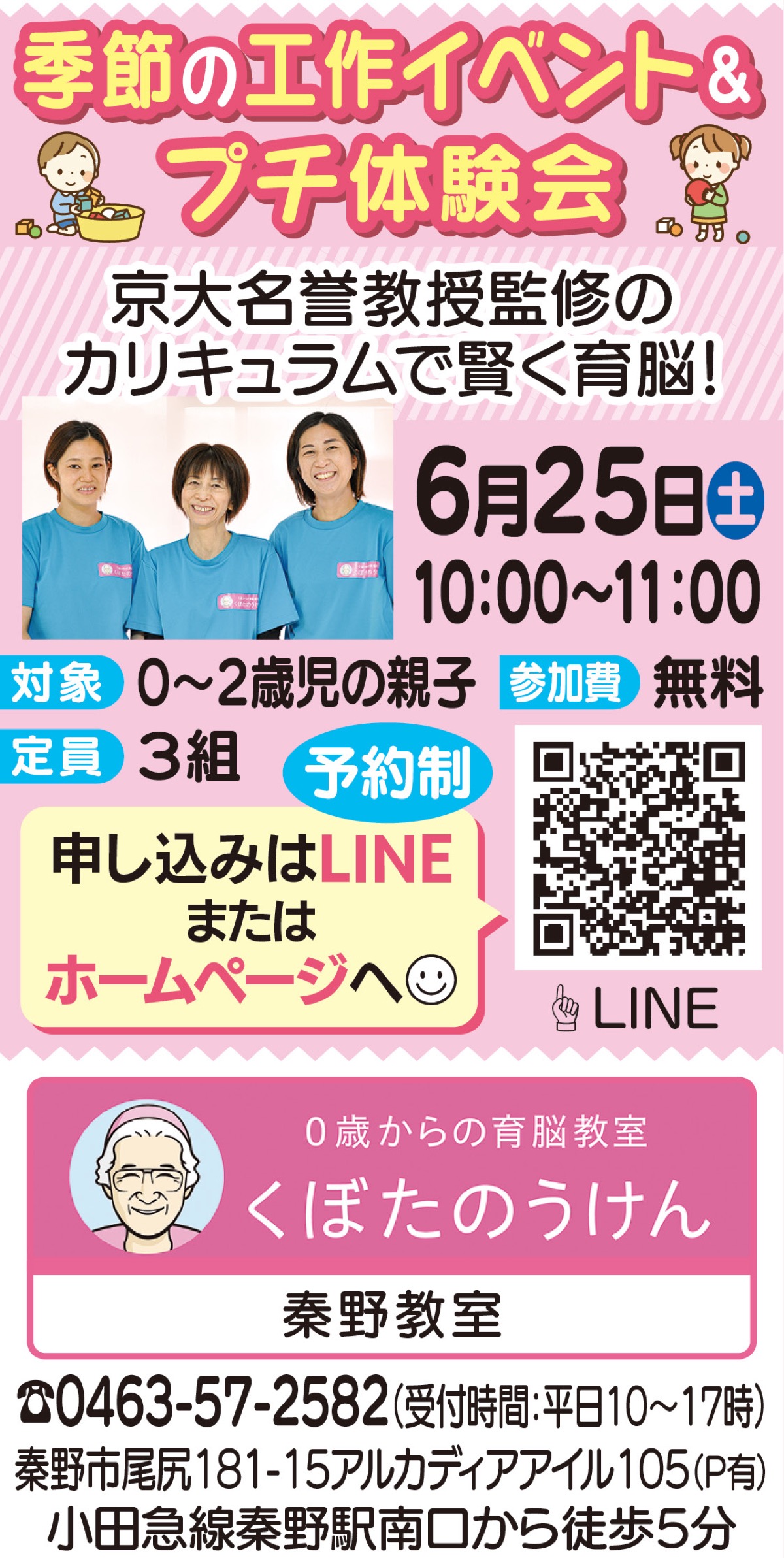 0〜3歳は子どもの成長にとって、とても大切な時期だといわれている。成長へのアプローチについて、昨年9月に開校した幼児教室『くぼたのうけん秦野教室』に話を聞いた。――「3歳までは脳が飛躍的に発達していく時期です。成長の黄金期に手や身体、感覚・認知を、月齢に合わせて鍛えていくことが大切。当教室では各分野のカリキュラムで親子で楽しく脳を鍛え、賢い子を育てます。家族運営でアットホームな雰囲気ですので、お気軽に体験会へお越しください!」