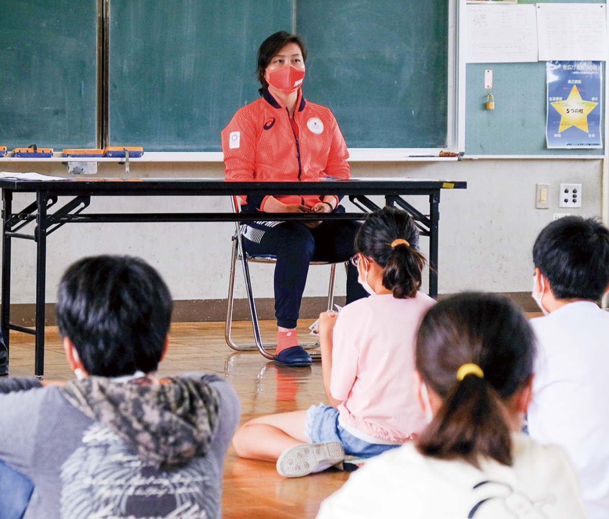 東京2020オリンピックで金メダルを獲得した女子ソフトボール日本代表選手の清原奈侑選手が7月5日に末広小学校を訪問し、同校の6年生児童に自身の体験談を話した。