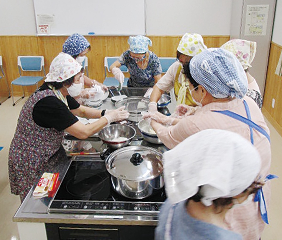 西公民館で7月9日、西地区女性交流会が開催され、郷土料理の一つである「へらへら団子」作りが行われた。