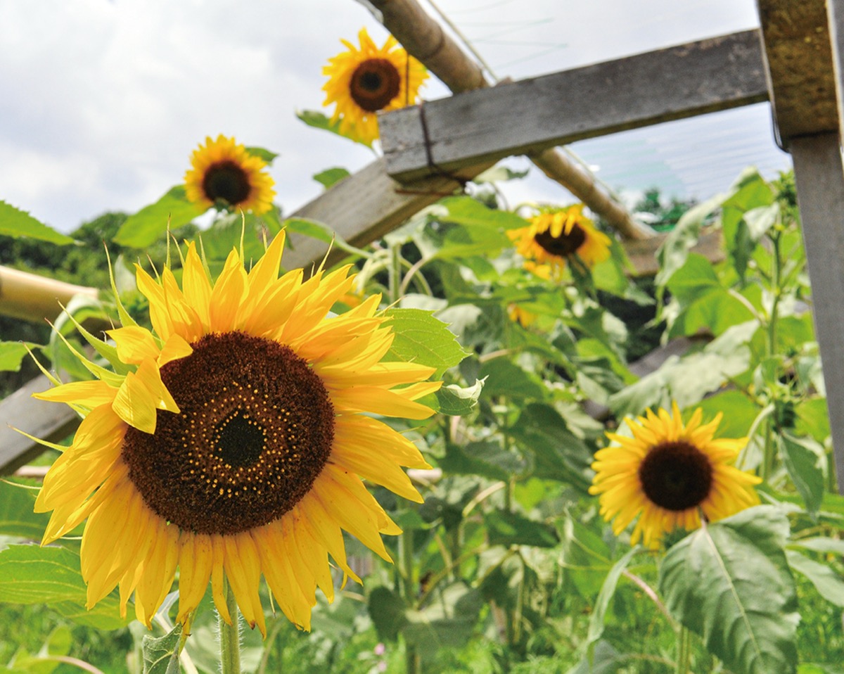 秦野市西田原(西田原337金蔵院北側付近)にある畑の道路沿いで、例年道行く人の目を楽しませているヒマワリが、今年も見ごろを迎えている。このヒマワリは秦野市里地里山を育む会(浅見一義会長)が、地域の防犯力を高め、花を楽しんでもらうために植えたもの。浅見さんは約5600平方メートルの土地を管理しており、ラオスやカンボジアなど、市内に住む外国籍の人が農作業を通して親睦を深め、食を楽しめる場を作るために尽力している。その活動が評価され、2021年にはラオス親善大使にも任命された。