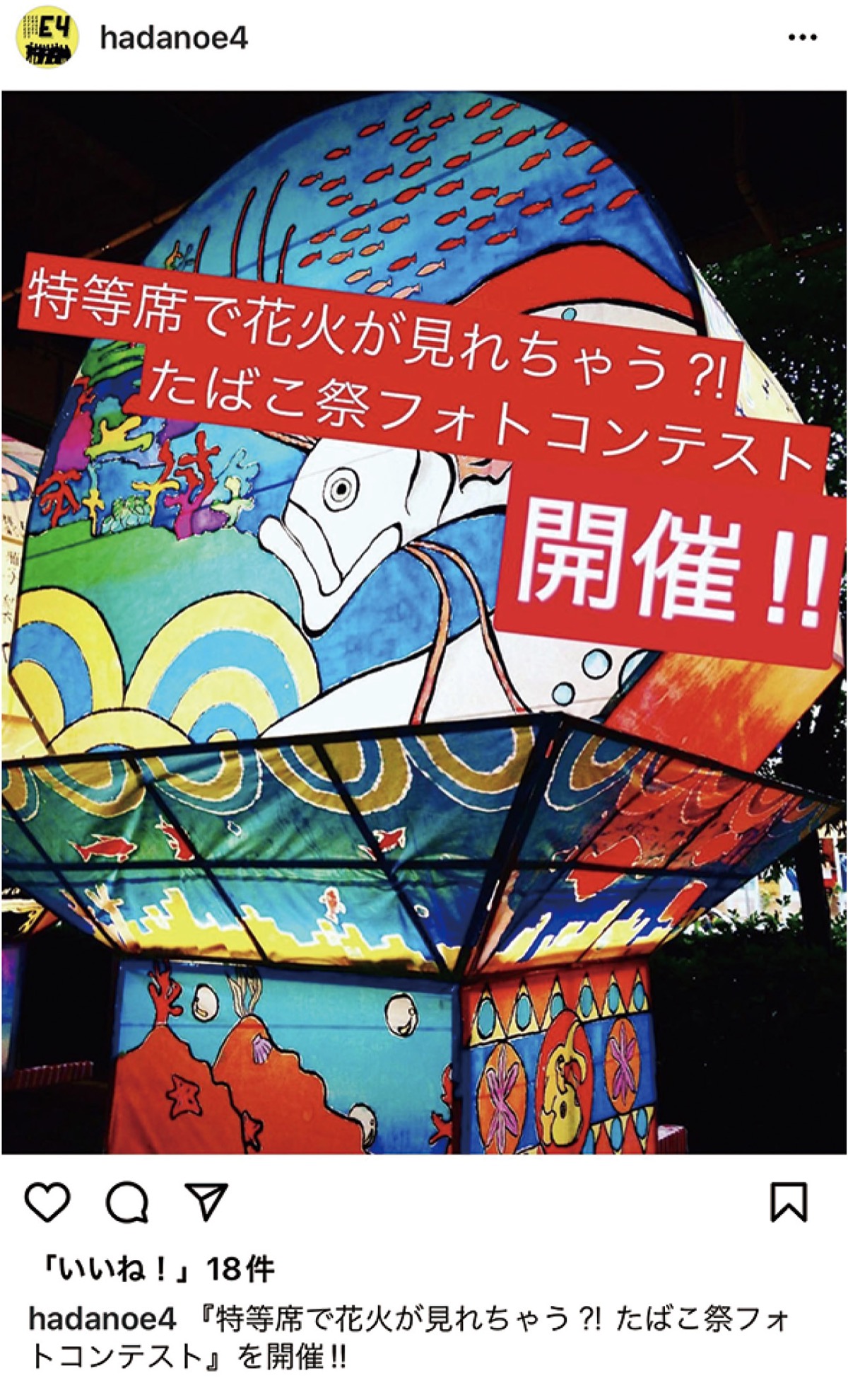 参加条件は学生団体E4のインスタアカウント(hadanoe4)をフォロー。前半は「#私とたばこ祭」をつけて、「過去のたばこ祭」の写真を投稿する。応募期間は9月10日(土)まで。入賞者には秦野市役所の屋上で花火を見ることができるペアチケットと副賞が進呈される。